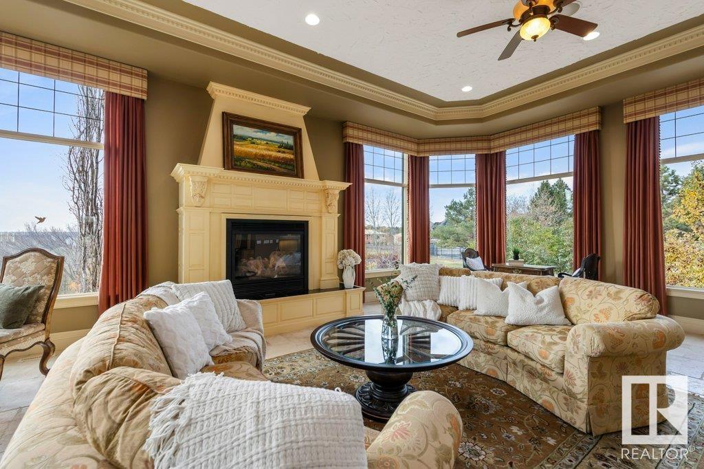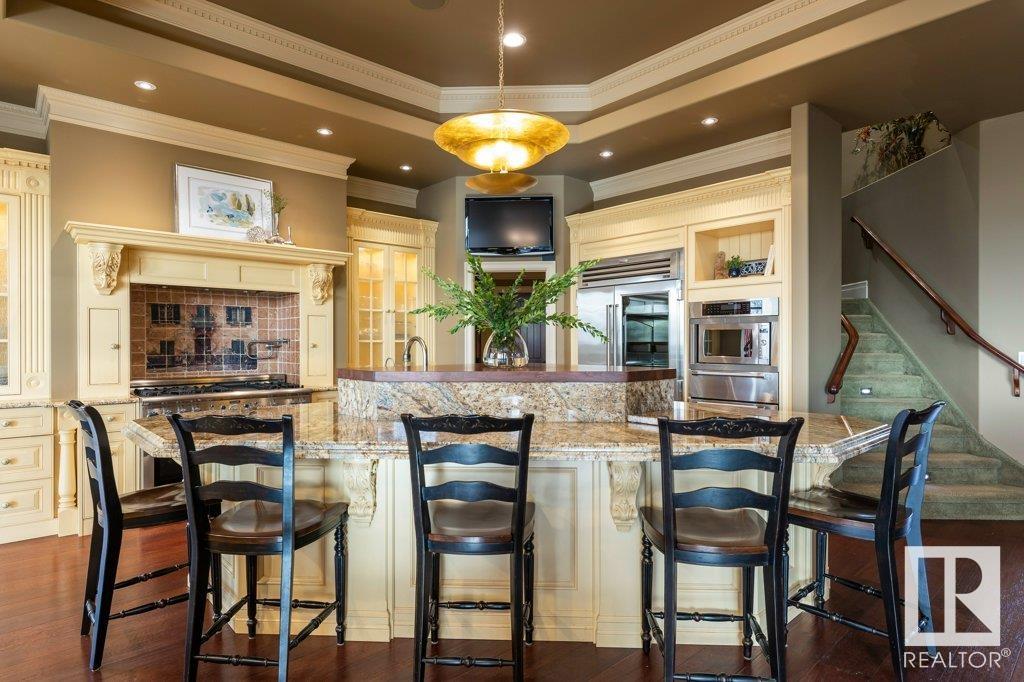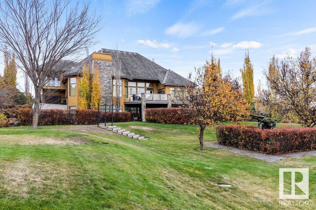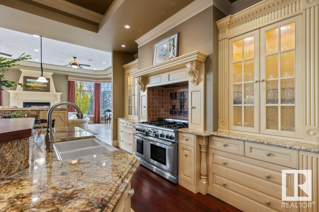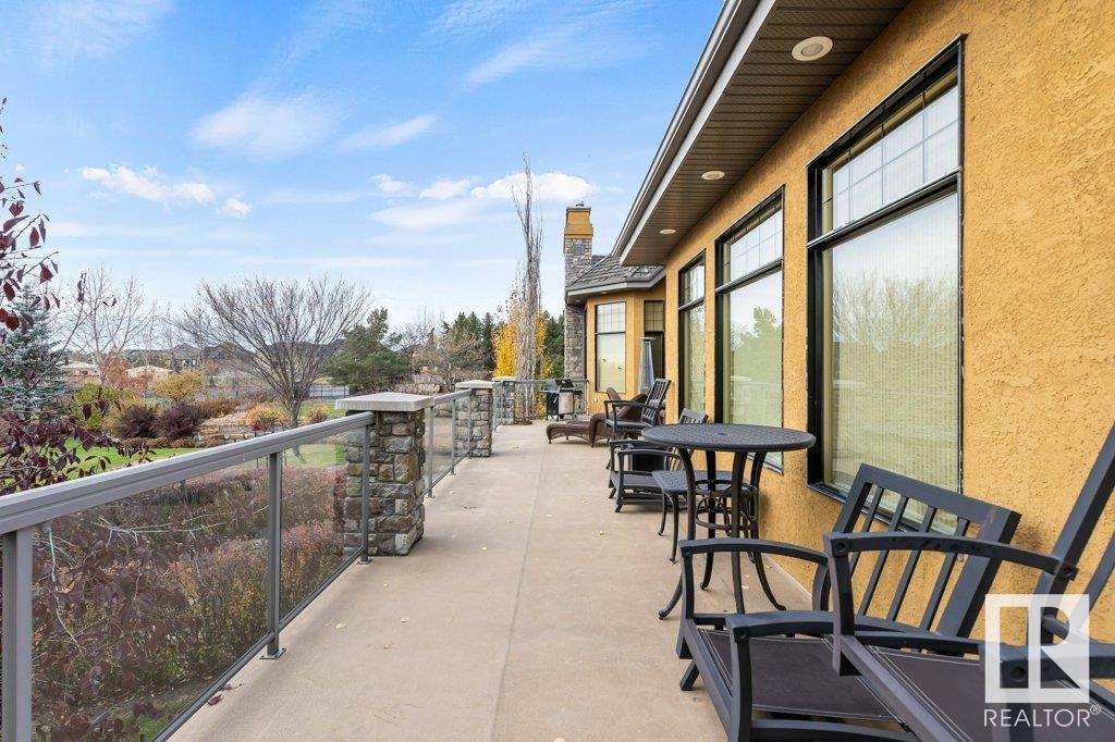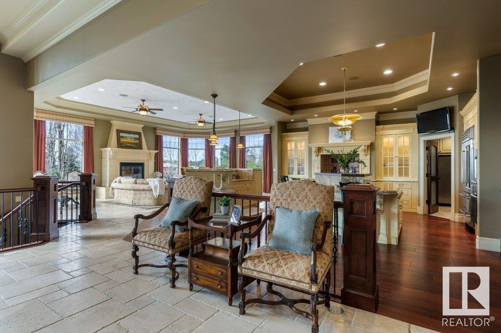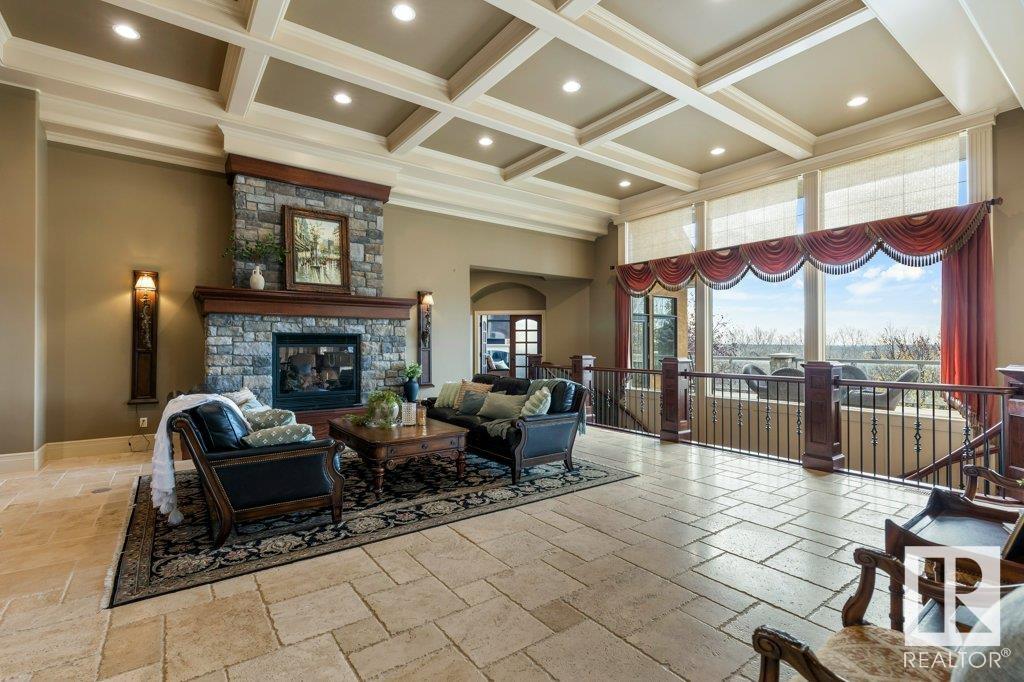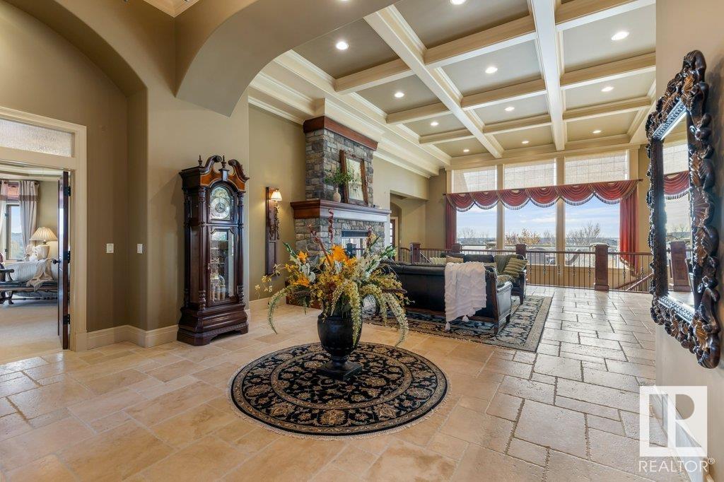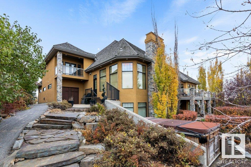DISCOVER YOUR PRIVATE SANCTUARY IN RIVERSTONE POINTE FEATURING 8,800 SQFT OF SPECTACULAR LIVING SPACE this walk-out bungalow offers a rare blend of luxury and tranquility. With stunning river valley views, this custom-built masterpiece boasts captivating curb appeal, custom stone pillars, & a quad garage. Step inside to experience a true sanctuary, barrel roll ceiling, complete with limestone, cork & mahogany floors, coffered ceilings, custom millwork, grand designer staircase & banks of windows. The gourmet kitchen inspired by Clive Christian, featuring Brazilian hardwood, granite countertops, two expansive breakfast bar islands, and a massive pantry. Retreat to the resort-style primary suite, which includes a spa-inspired 6-piece ensuite with double stone showers, a gas fireplace and a lavish walk-in closet. With 5 bedrooms, 7 bathrooms, & 6 fireplaces, library, theatre room, exercise room, radiant heat, 52 ft. balcony & sports court, this home is perfect for both relaxation & entertaining!