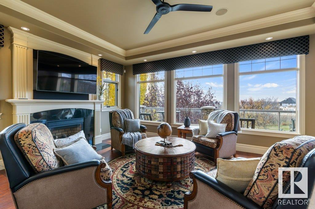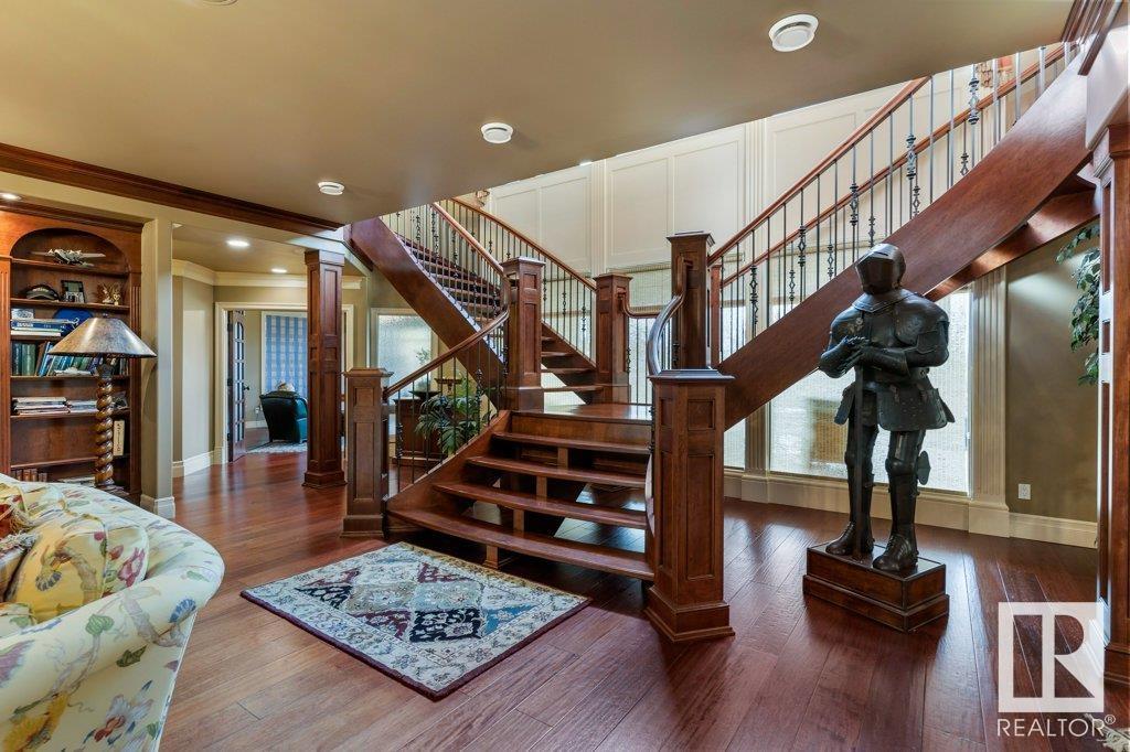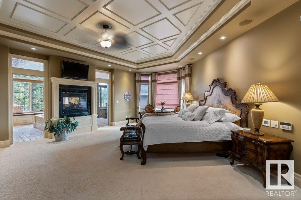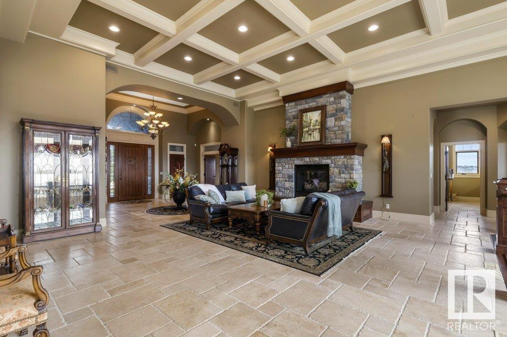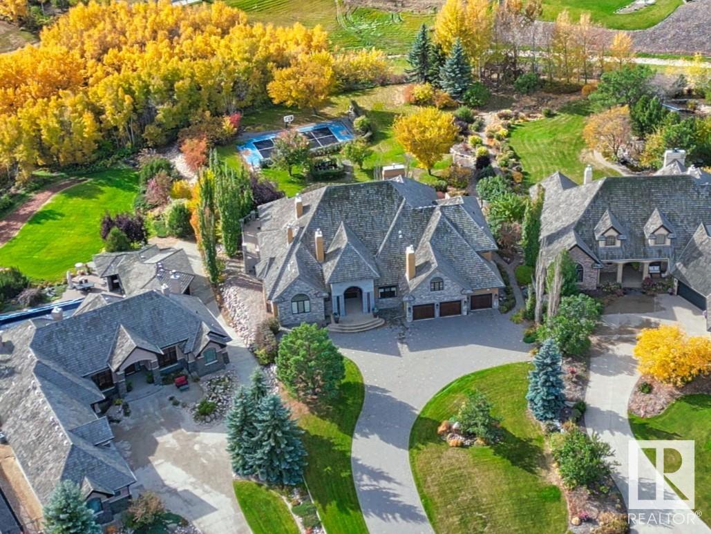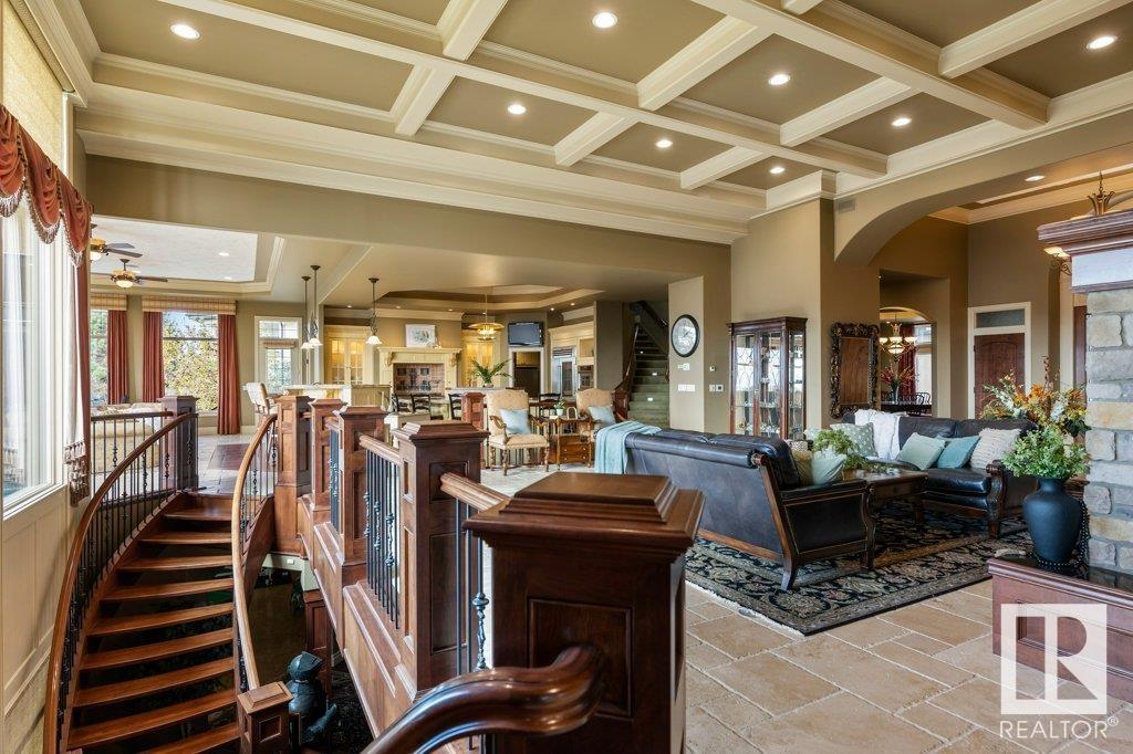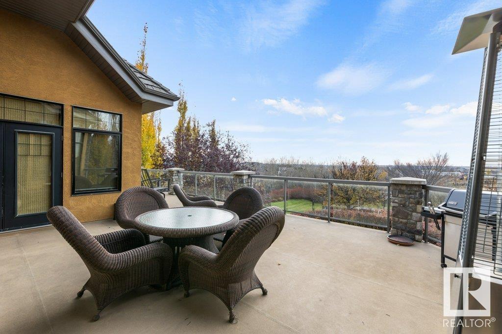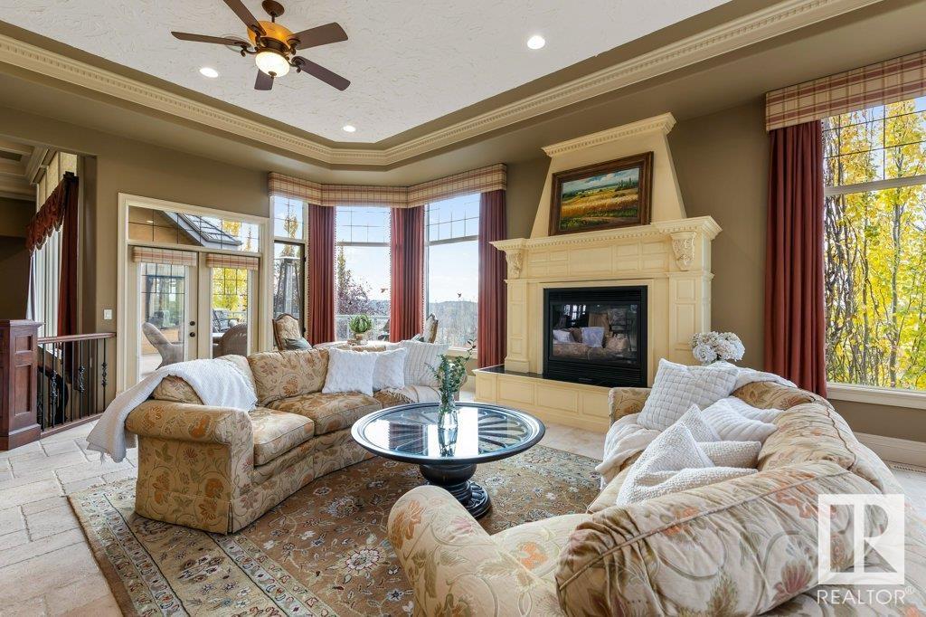 DISCOVER YOUR PRIVATE SANCTUARY IN RIVERSTONE POINTE FEATURING 8,800 SQFT OF SPECTACULAR LIVING SPACE this walk-out bungalow offers a rare blend of luxury and tranquility. With stunning river valley views, this custom-built masterpiece boasts captivating curb appeal, custom stone pillars, & a quad garage. Step inside to experience a true sanctuary, barrel roll ceiling, complete with limestone, cork & mahogany floors, coffered ceilings, custom millwork, grand designer staircase & banks of windows. The gourmet kitchen inspired by Clive Christian, featuring Brazilian hardwood, granite countertops, two expansive breakfast bar islands, and a massive pantry. Retreat to the resort-style primary suite, which includes a spa-inspired 6-piece ensuite with double stone showers, a gas fireplace and a lavish walk-in closet. With 5 bedrooms, 7 bathrooms, & 6 fireplaces, library, theatre room, exercise room, radiant heat, 52 ft. balcony & sports court, this home is perfect for both relaxation & entertaining!
