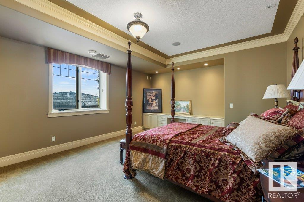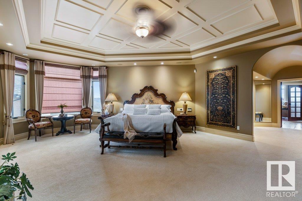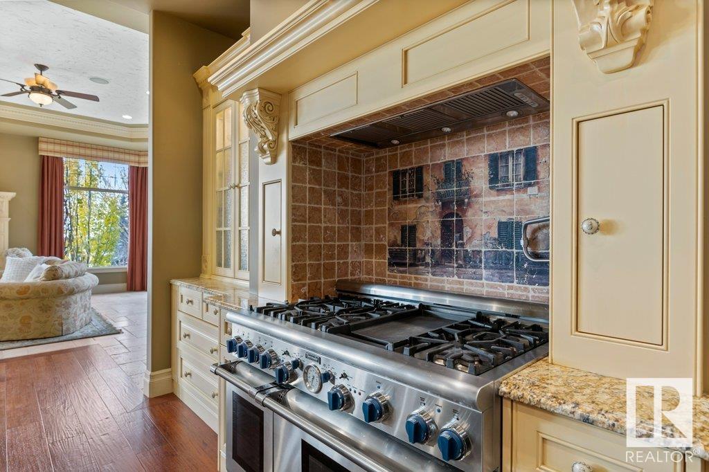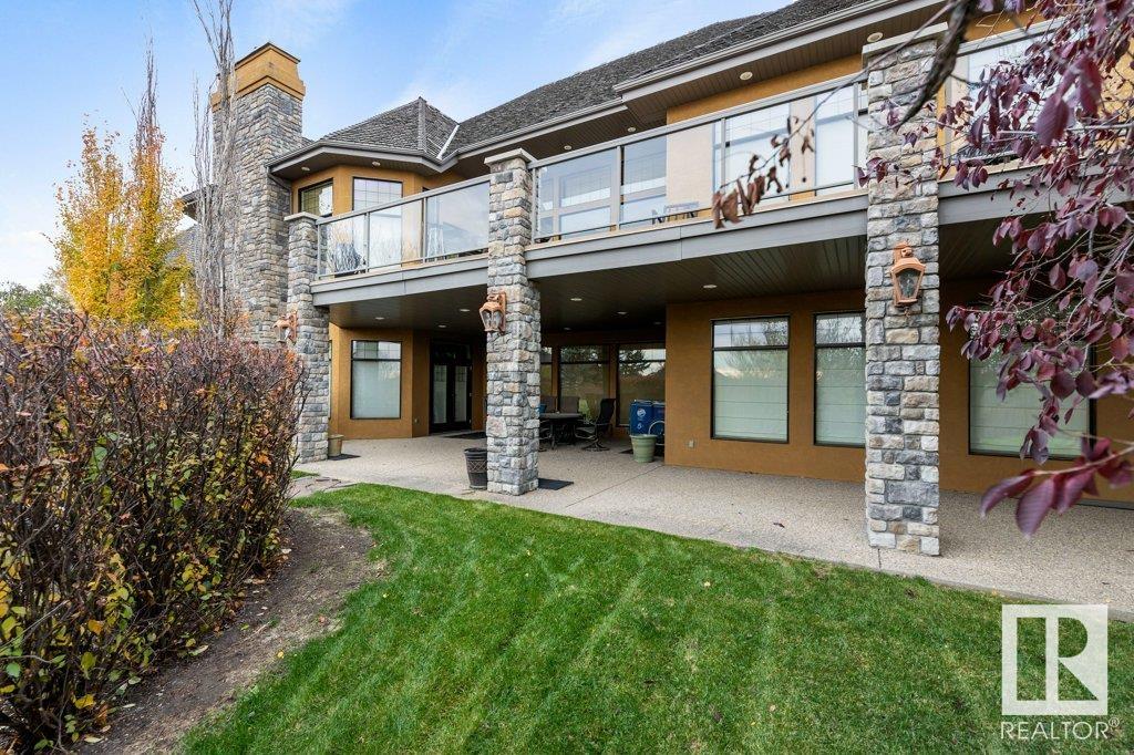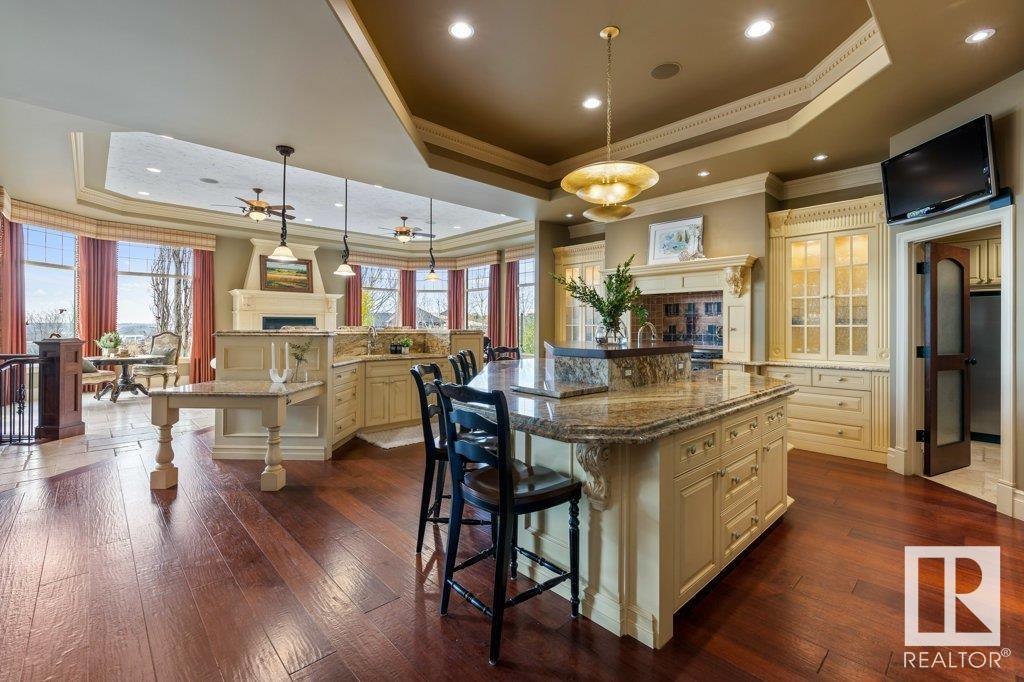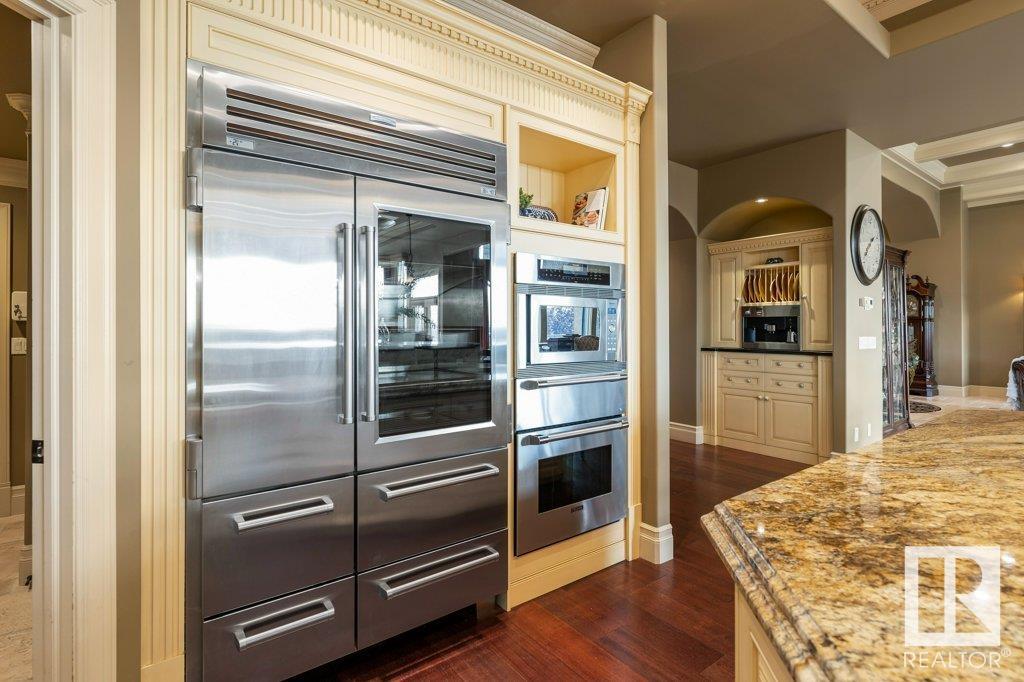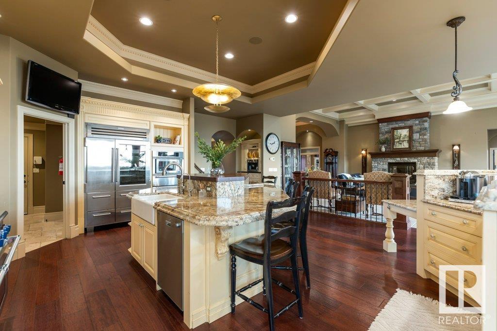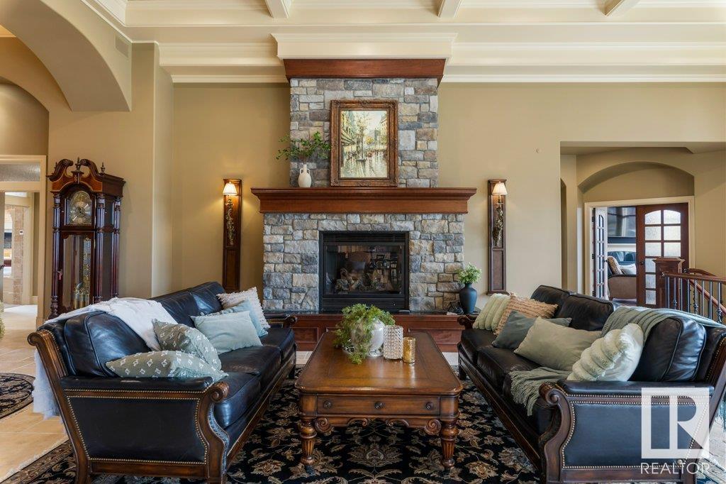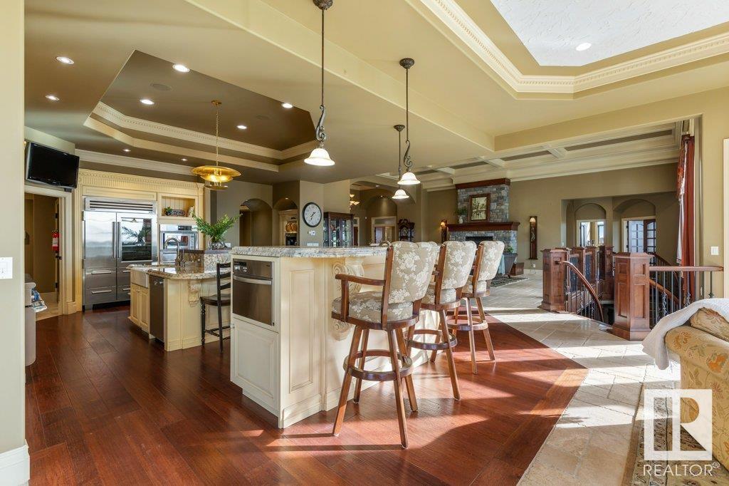 DISCOVER YOUR PRIVATE SANCTUARY IN RIVERSTONE POINTE FEATURING 8,800 SQFT OF SPECTACULAR LIVING SPACE this walk-out bungalow offers a rare blend of luxury and tranquility. With stunning river valley views, this custom-built masterpiece boasts captivating curb appeal, custom stone pillars, & a quad garage. Step inside to experience a true sanctuary, barrel roll ceiling, complete with limestone, cork & mahogany floors, coffered ceilings, custom millwork, grand designer staircase & banks of windows. The gourmet kitchen inspired by Clive Christian, featuring Brazilian hardwood, granite countertops, two expansive breakfast bar islands, and a massive pantry. Retreat to the resort-style primary suite, which includes a spa-inspired 6-piece ensuite with double stone showers, a gas fireplace and a lavish walk-in closet. With 5 bedrooms, 7 bathrooms, & 6 fireplaces, library, theatre room, exercise room, radiant heat, 52 ft. balcony & sports court, this home is perfect for both relaxation & entertaining!