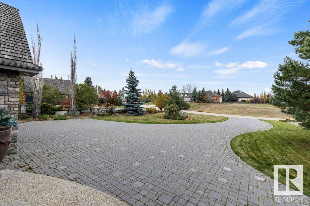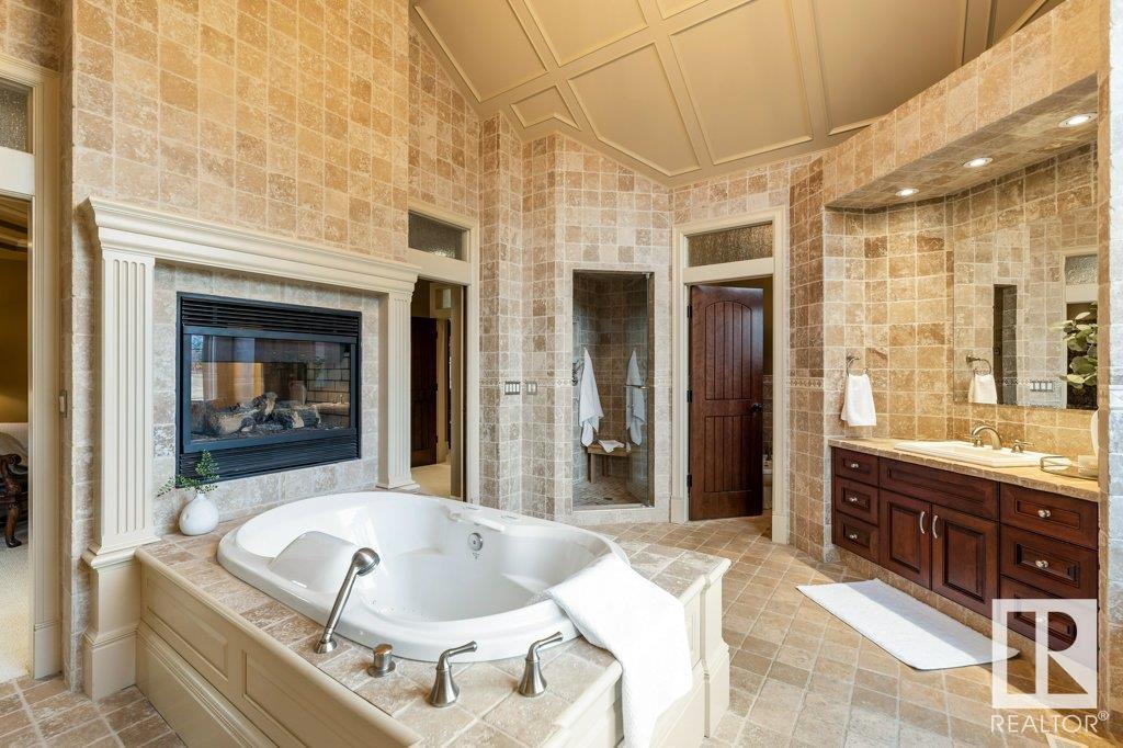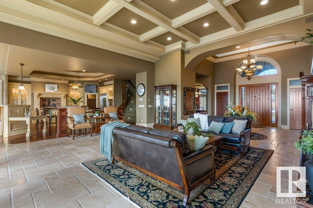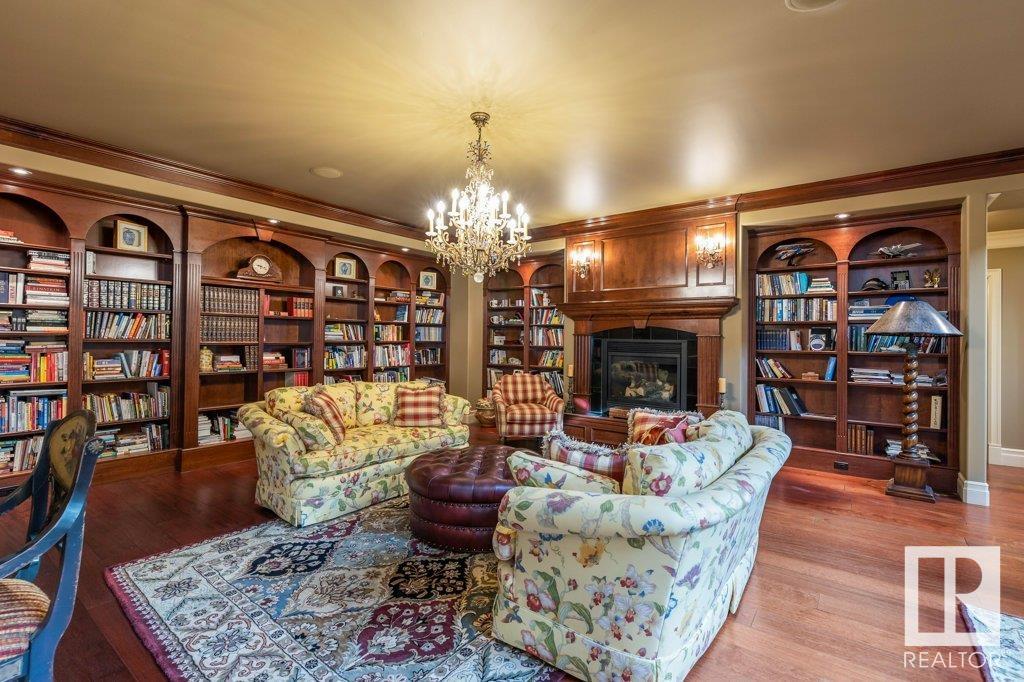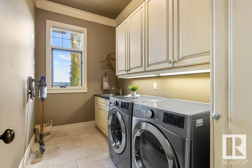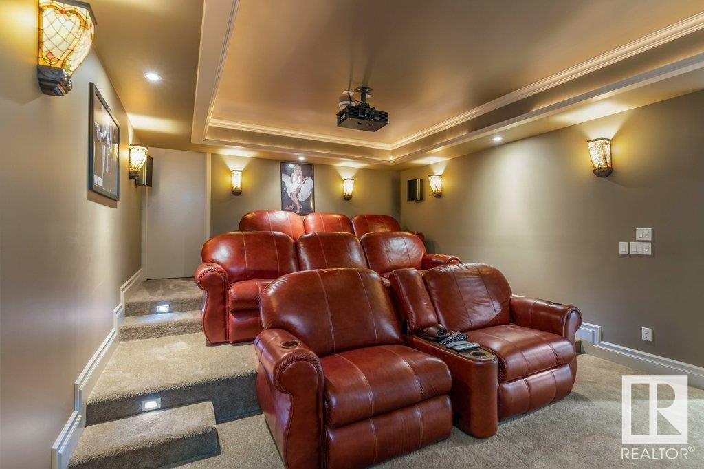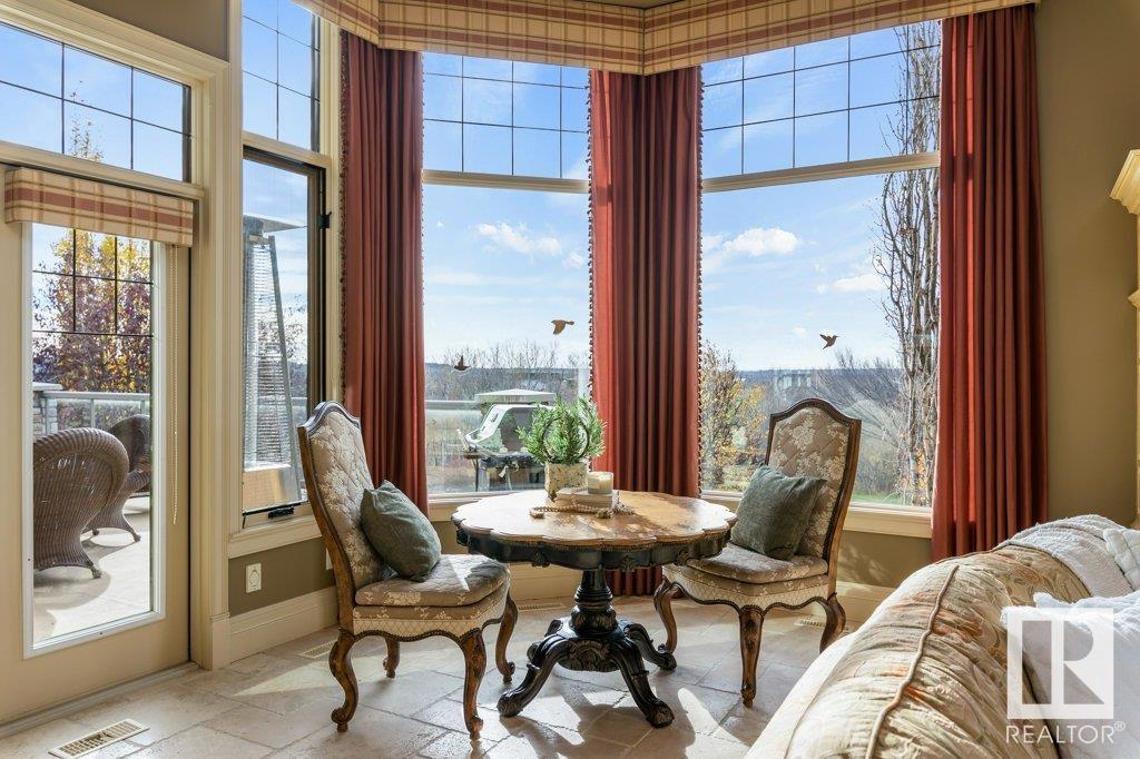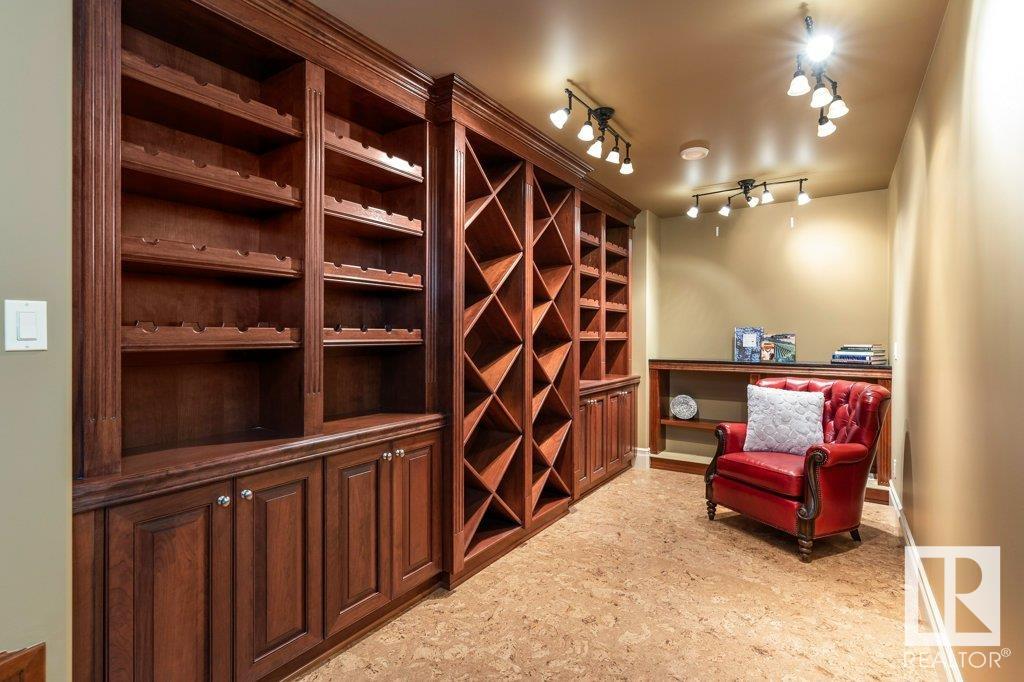 DISCOVER YOUR PRIVATE SANCTUARY IN RIVERSTONE POINTE FEATURING 8,800 SQFT OF SPECTACULAR LIVING SPACE this walk-out bungalow offers a rare blend of luxury and tranquility. With stunning river valley views, this custom-built masterpiece boasts captivating curb appeal, custom stone pillars, & a quad garage. Step inside to experience a true sanctuary, barrel roll ceiling, complete with limestone, cork & mahogany floors, coffered ceilings, custom millwork, grand designer staircase & banks of windows. The gourmet kitchen inspired by Clive Christian, featuring Brazilian hardwood, granite countertops, two expansive breakfast bar islands, and a massive pantry. Retreat to the resort-style primary suite, which includes a spa-inspired 6-piece ensuite with double stone showers, a gas fireplace and a lavish walk-in closet. With 5 bedrooms, 7 bathrooms, & 6 fireplaces, library, theatre room, exercise room, radiant heat, 52 ft. balcony & sports court, this home is perfect for both relaxation & entertaining!