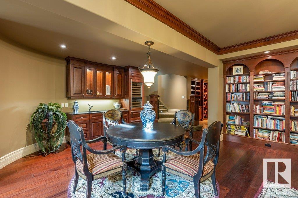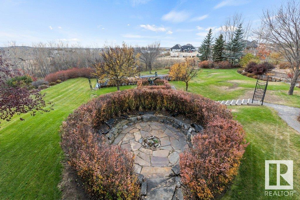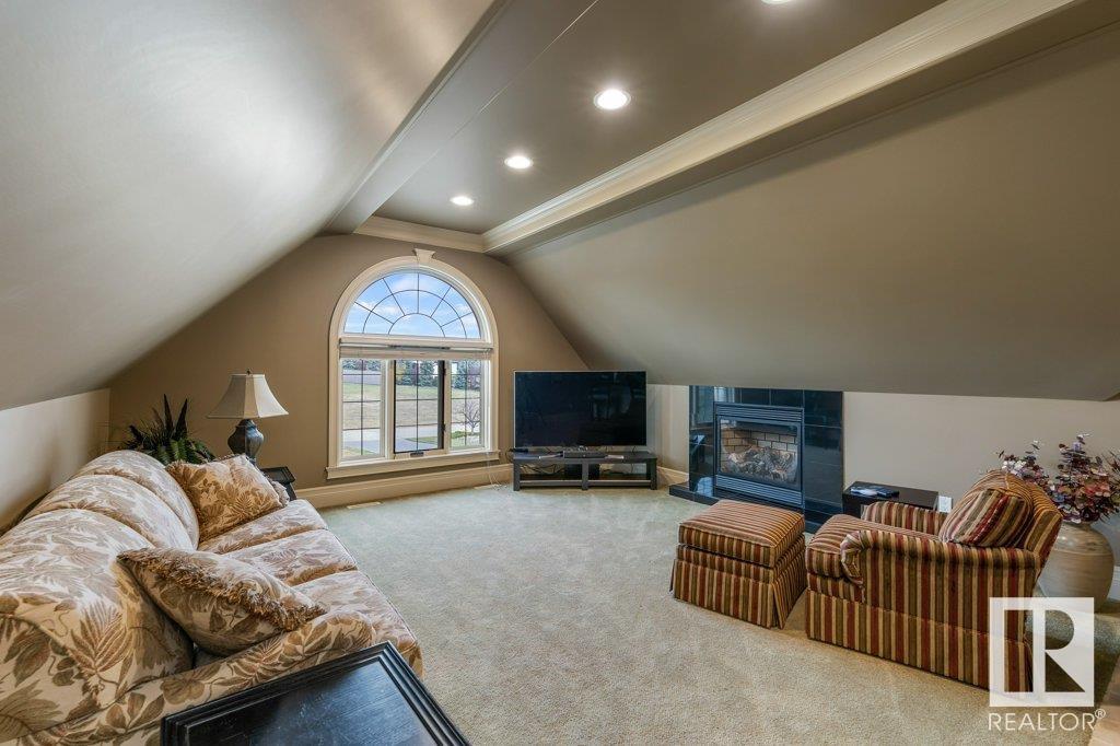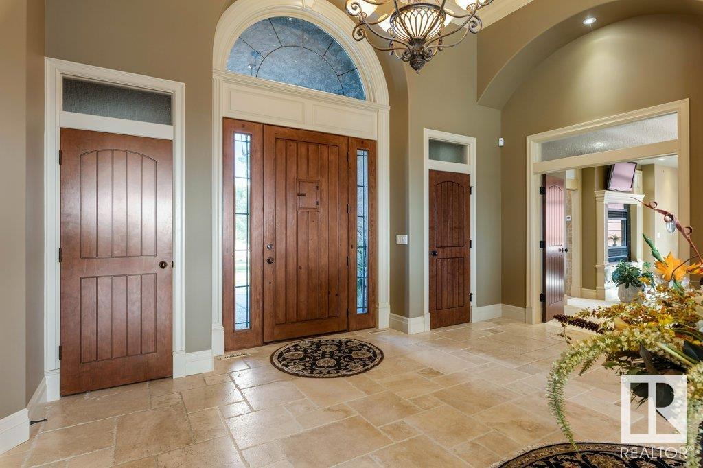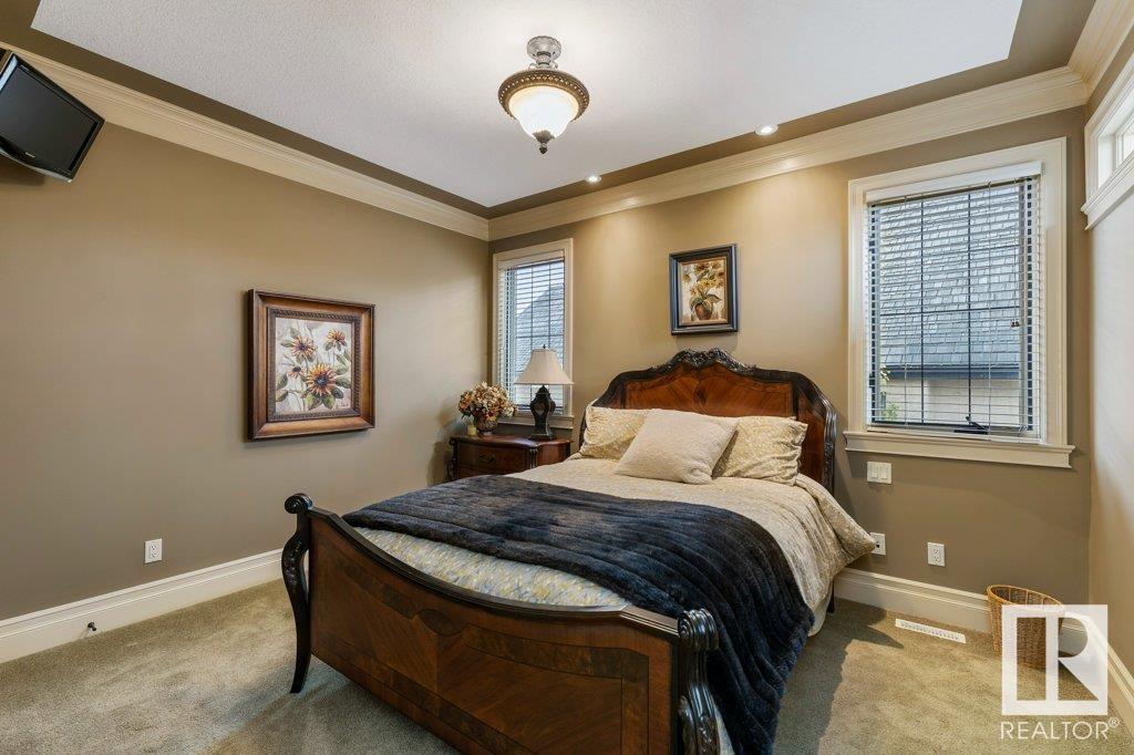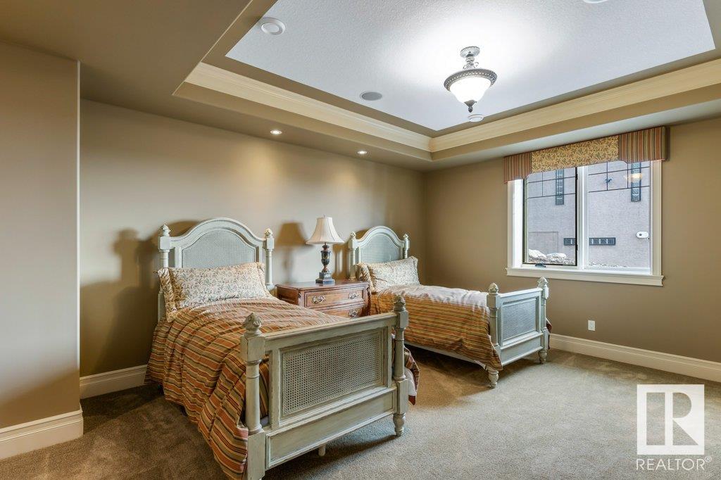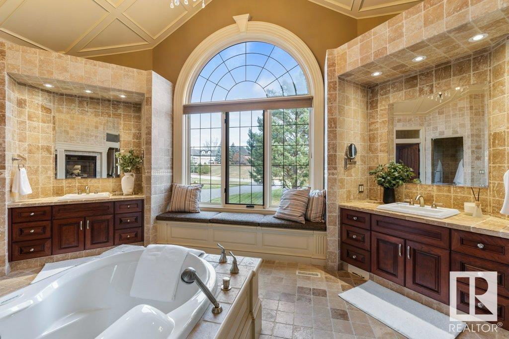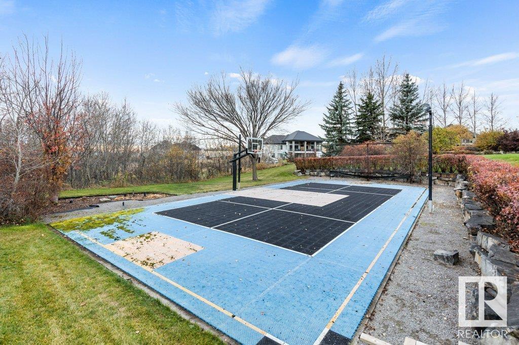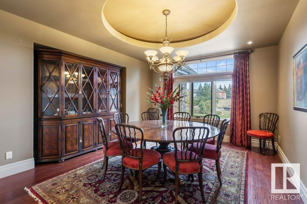 DISCOVER YOUR PRIVATE SANCTUARY IN RIVERSTONE POINTE FEATURING 8,800 SQFT OF SPECTACULAR LIVING SPACE this walk-out bungalow offers a rare blend of luxury and tranquility. With stunning river valley views, this custom-built masterpiece boasts captivating curb appeal, custom stone pillars, & a quad garage. Step inside to experience a true sanctuary, barrel roll ceiling, complete with limestone, cork & mahogany floors, coffered ceilings, custom millwork, grand designer staircase & banks of windows. The gourmet kitchen inspired by Clive Christian, featuring Brazilian hardwood, granite countertops, two expansive breakfast bar islands, and a massive pantry. Retreat to the resort-style primary suite, which includes a spa-inspired 6-piece ensuite with double stone showers, a gas fireplace and a lavish walk-in closet. With 5 bedrooms, 7 bathrooms, & 6 fireplaces, library, theatre room, exercise room, radiant heat, 52 ft. balcony & sports court, this home is perfect for both relaxation & entertaining!