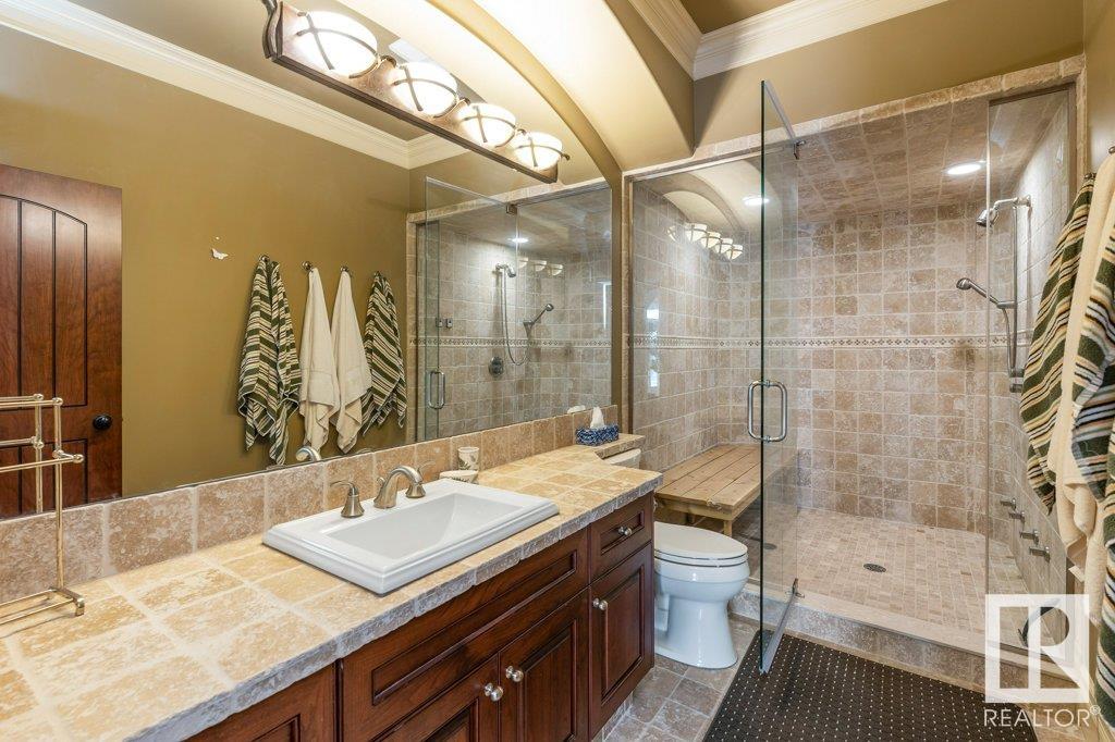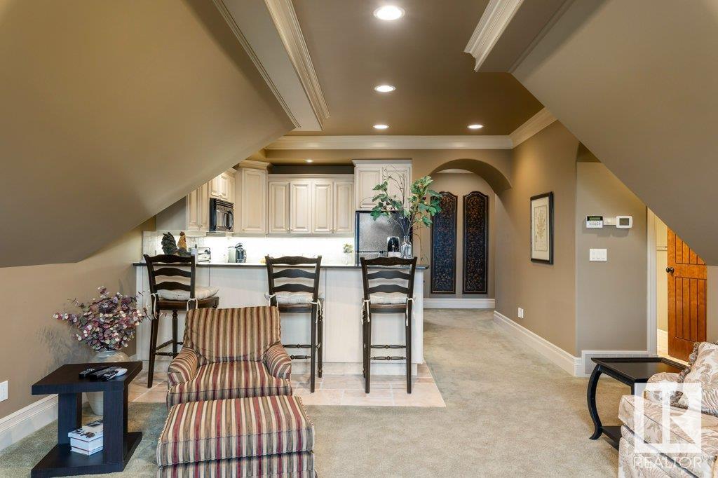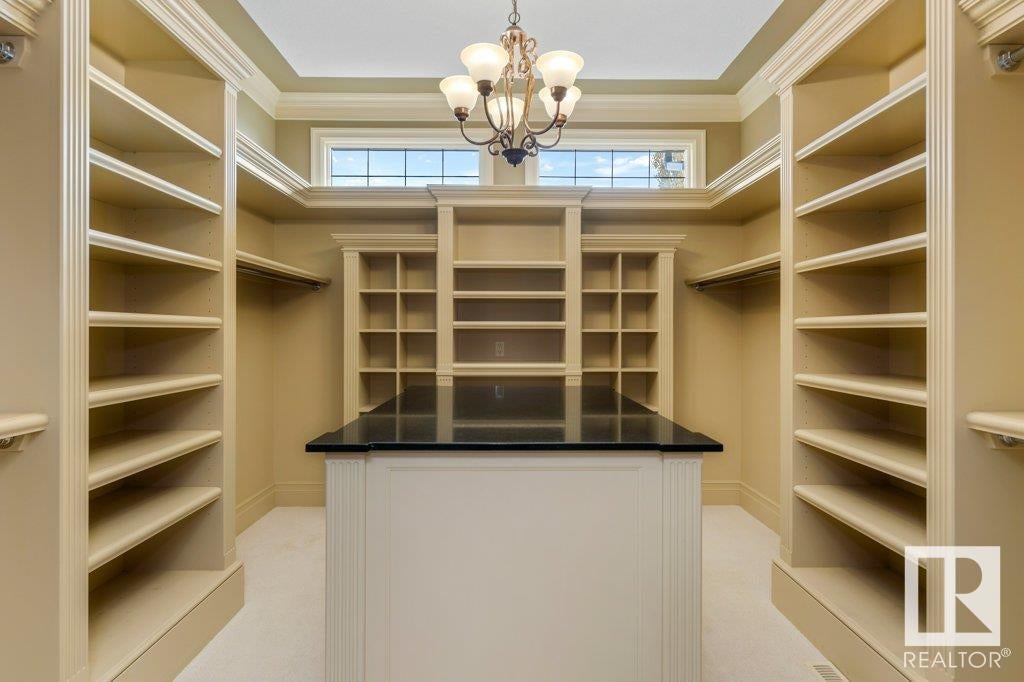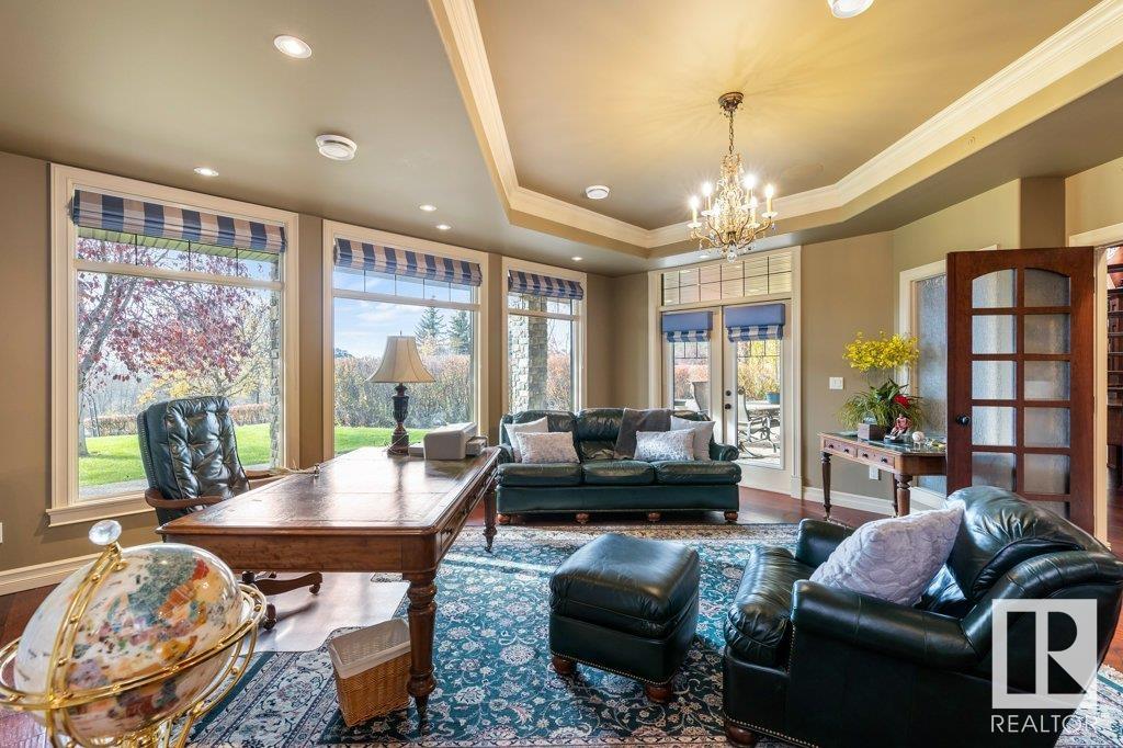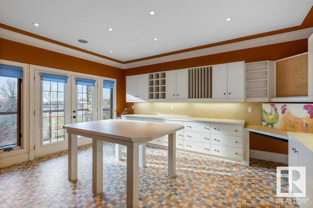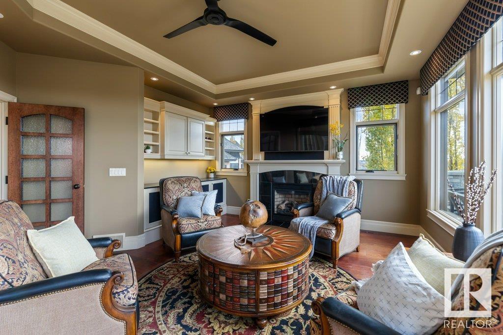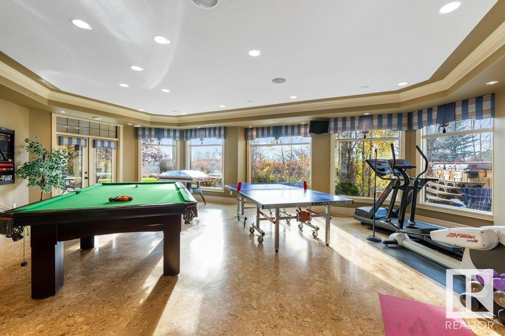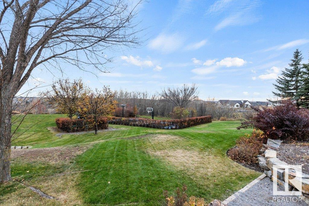 DISCOVER YOUR PRIVATE SANCTUARY IN RIVERSTONE POINTE FEATURING 8,800 SQFT OF SPECTACULAR LIVING SPACE this walk-out bungalow offers a rare blend of luxury and tranquility. With stunning river valley views, this custom-built masterpiece boasts captivating curb appeal, custom stone pillars, & a quad garage. Step inside to experience a true sanctuary, barrel roll ceiling, complete with limestone, cork & mahogany floors, coffered ceilings, custom millwork, grand designer staircase & banks of windows. The gourmet kitchen inspired by Clive Christian, featuring Brazilian hardwood, granite countertops, two expansive breakfast bar islands, and a massive pantry. Retreat to the resort-style primary suite, which includes a spa-inspired 6-piece ensuite with double stone showers, a gas fireplace and a lavish walk-in closet. With 5 bedrooms, 7 bathrooms, & 6 fireplaces, library, theatre room, exercise room, radiant heat, 52 ft. balcony & sports court, this home is perfect for both relaxation & entertaining!