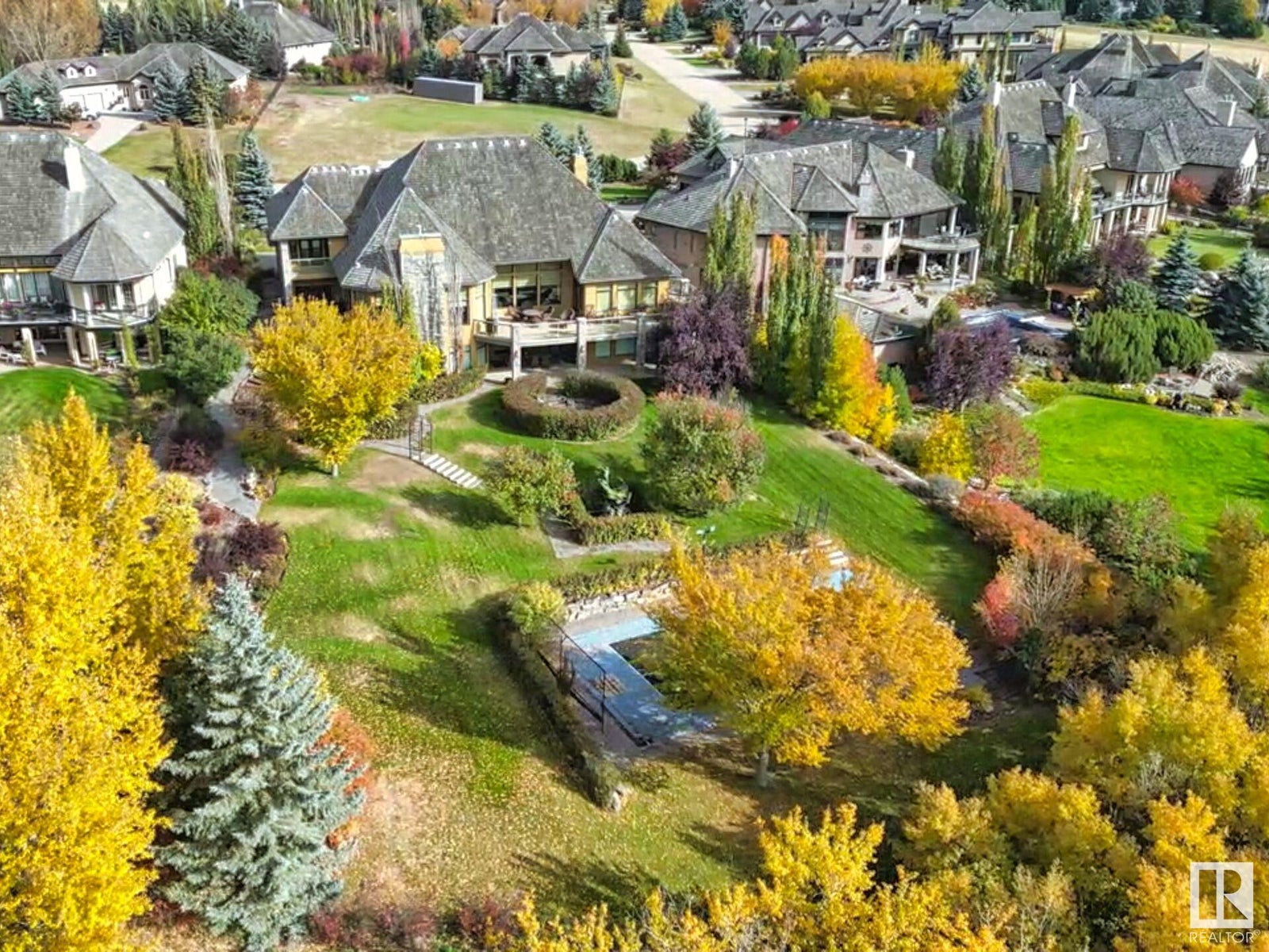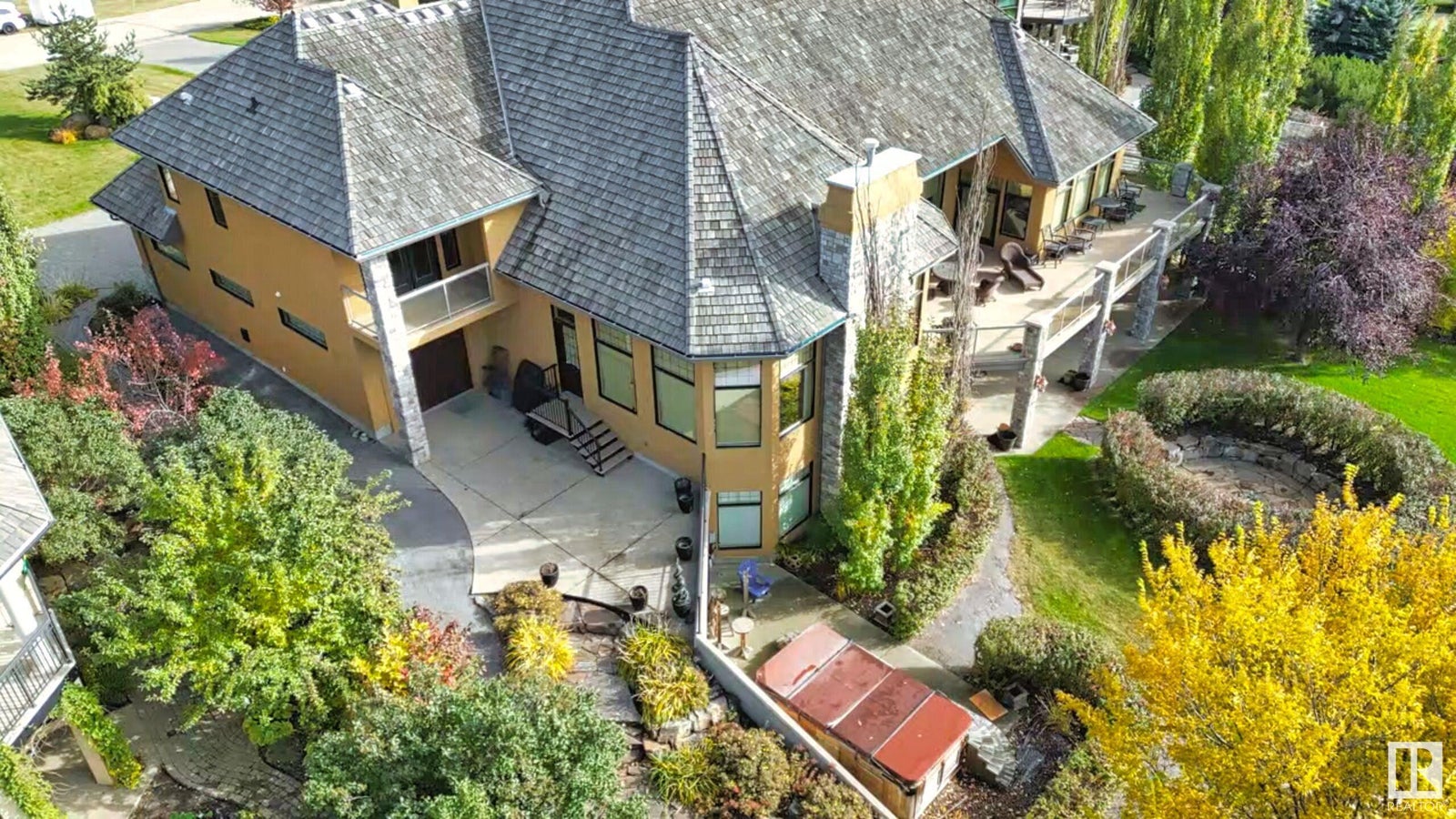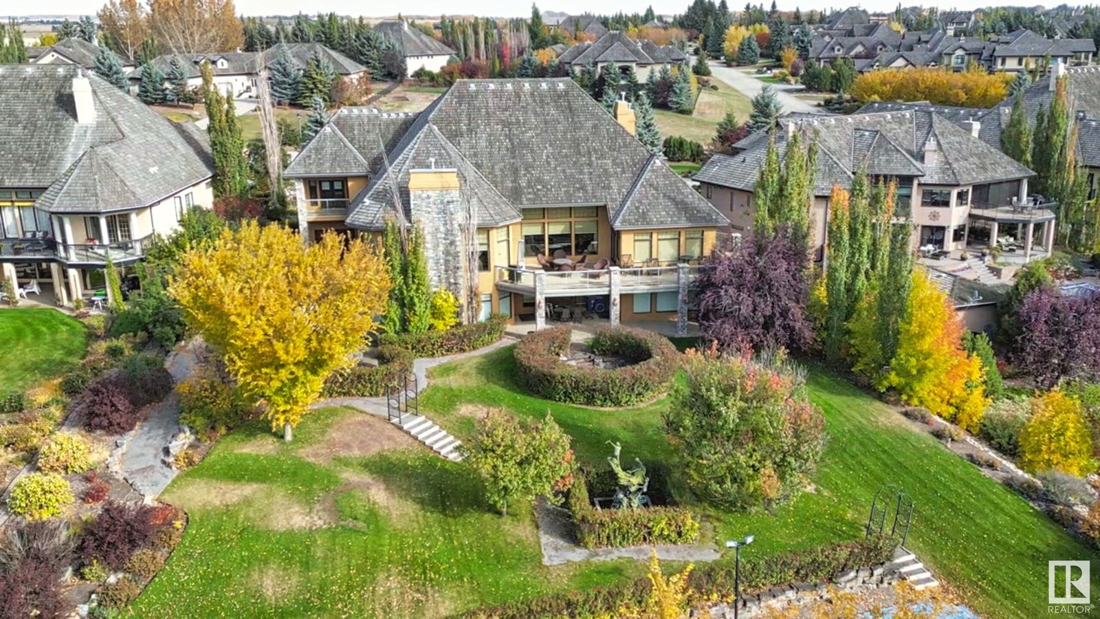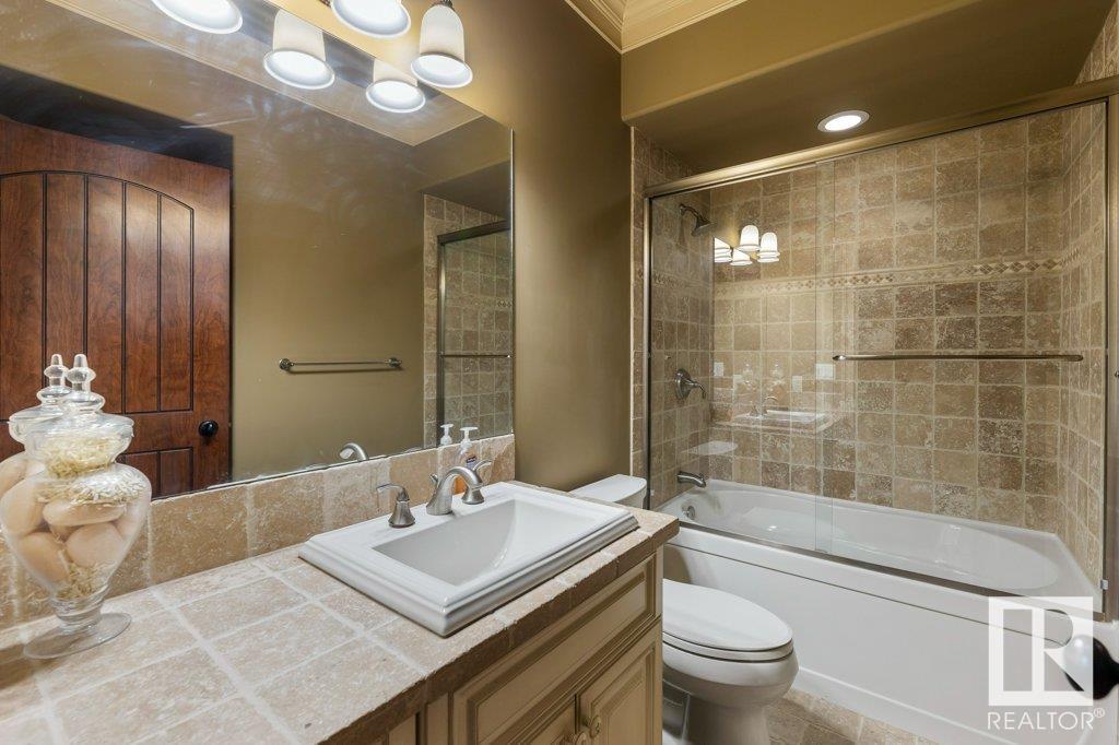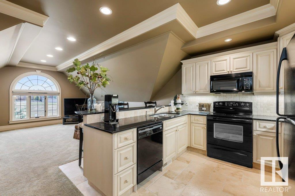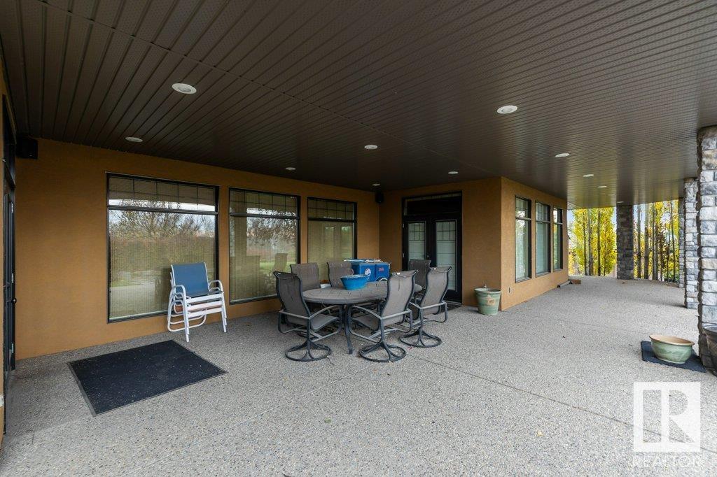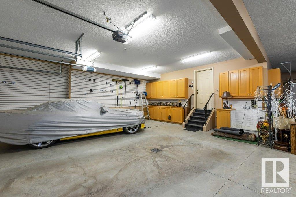DISCOVER YOUR PRIVATE SANCTUARY IN RIVERSTONE POINTE FEATURING 8,800 SQFT OF SPECTACULAR LIVING SPACE this walk-out bungalow offers a rare blend of luxury and tranquility. With stunning river valley views, this custom-built masterpiece boasts captivating curb appeal, custom stone pillars, & a quad garage. Step inside to experience a true sanctuary, barrel roll ceiling, complete with limestone, cork & mahogany floors, coffered ceilings, custom millwork, grand designer staircase & banks of windows. The gourmet kitchen inspired by Clive Christian, featuring Brazilian hardwood, granite countertops, two expansive breakfast bar islands, and a massive pantry. Retreat to the resort-style primary suite, which includes a spa-inspired 6-piece ensuite with double stone showers, a gas fireplace and a lavish walk-in closet. With 5 bedrooms, 7 bathrooms, & 6 fireplaces, library, theatre room, exercise room, radiant heat, 52 ft. balcony & sports court, this home is perfect for both relaxation & entertaining!