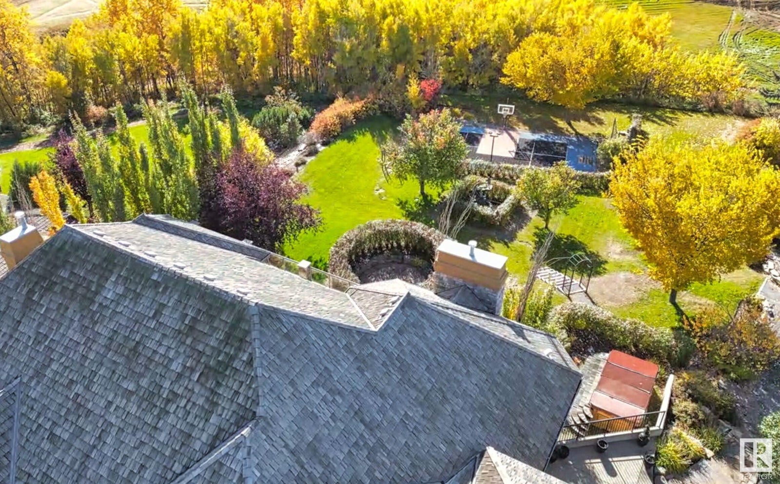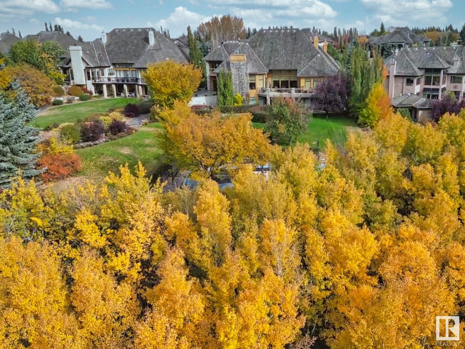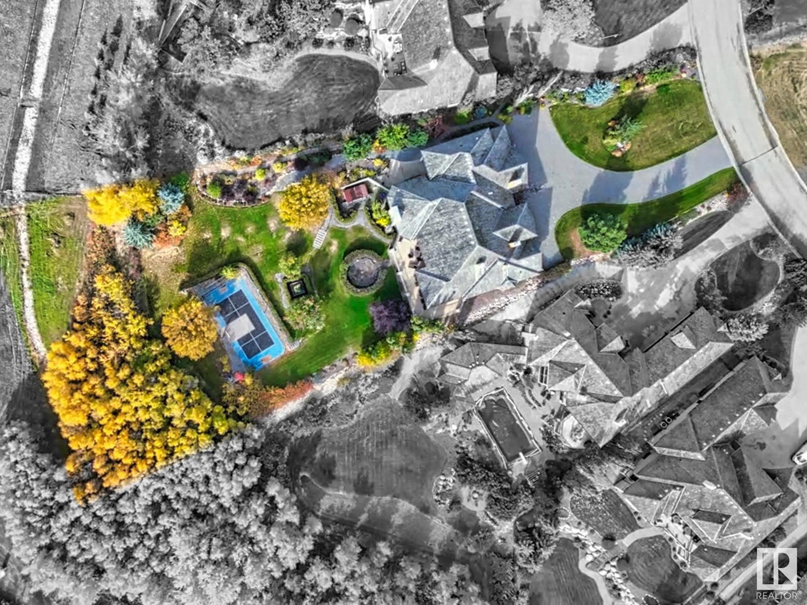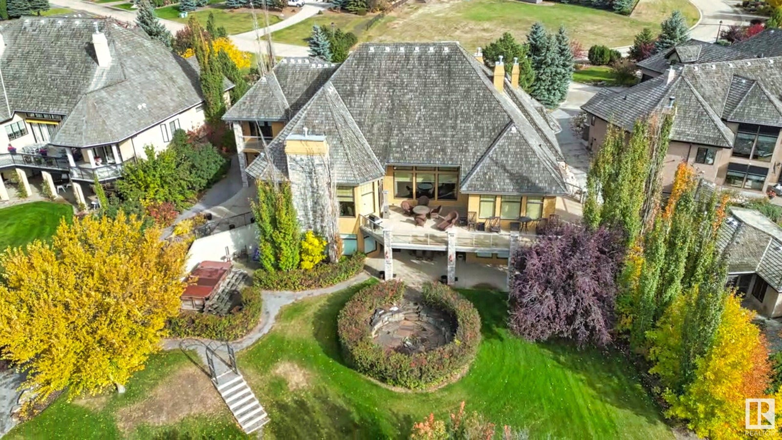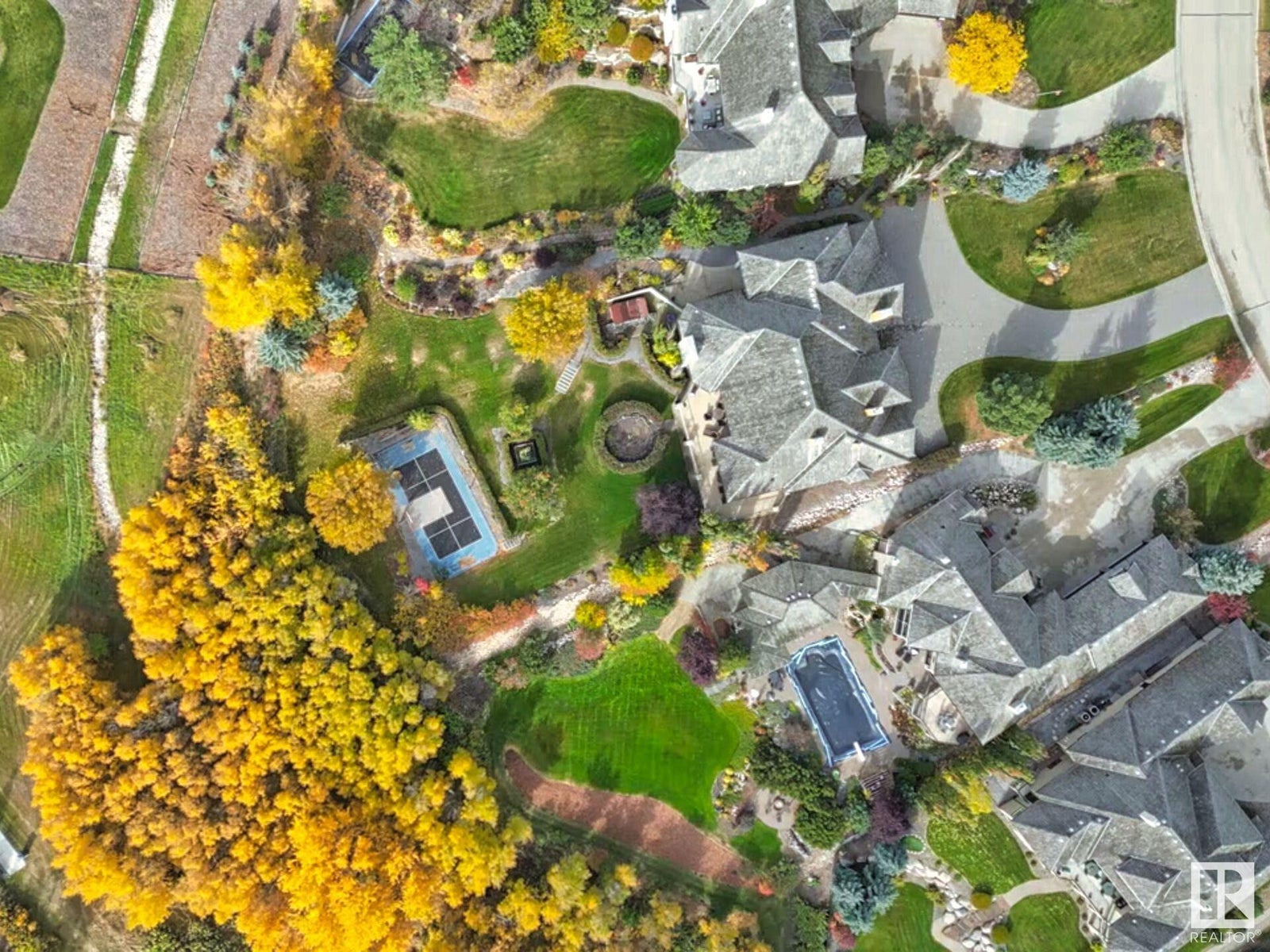 DISCOVER YOUR PRIVATE SANCTUARY IN RIVERSTONE POINTE FEATURING 8,800 SQFT OF SPECTACULAR LIVING SPACE this walk-out bungalow offers a rare blend of luxury and tranquility. With stunning river valley views, this custom-built masterpiece boasts captivating curb appeal, custom stone pillars, & a quad garage. Step inside to experience a true sanctuary, barrel roll ceiling, complete with limestone, cork & mahogany floors, coffered ceilings, custom millwork, grand designer staircase & banks of windows. The gourmet kitchen inspired by Clive Christian, featuring Brazilian hardwood, granite countertops, two expansive breakfast bar islands, and a massive pantry. Retreat to the resort-style primary suite, which includes a spa-inspired 6-piece ensuite with double stone showers, a gas fireplace and a lavish walk-in closet. With 5 bedrooms, 7 bathrooms, & 6 fireplaces, library, theatre room, exercise room, radiant heat, 52 ft. balcony & sports court, this home is perfect for both relaxation & entertaining!