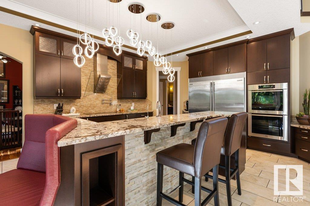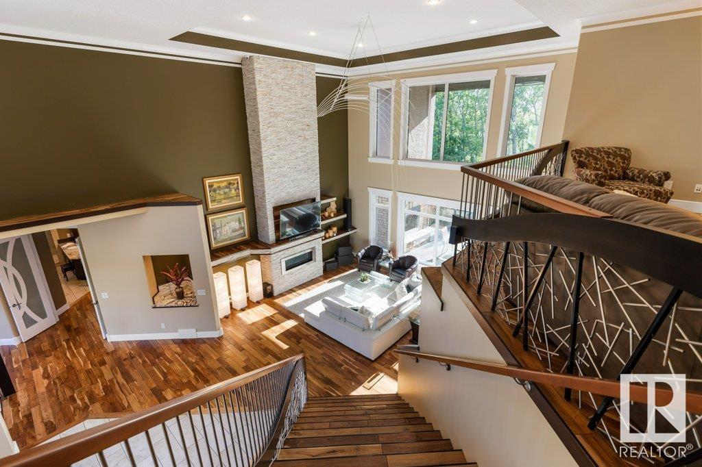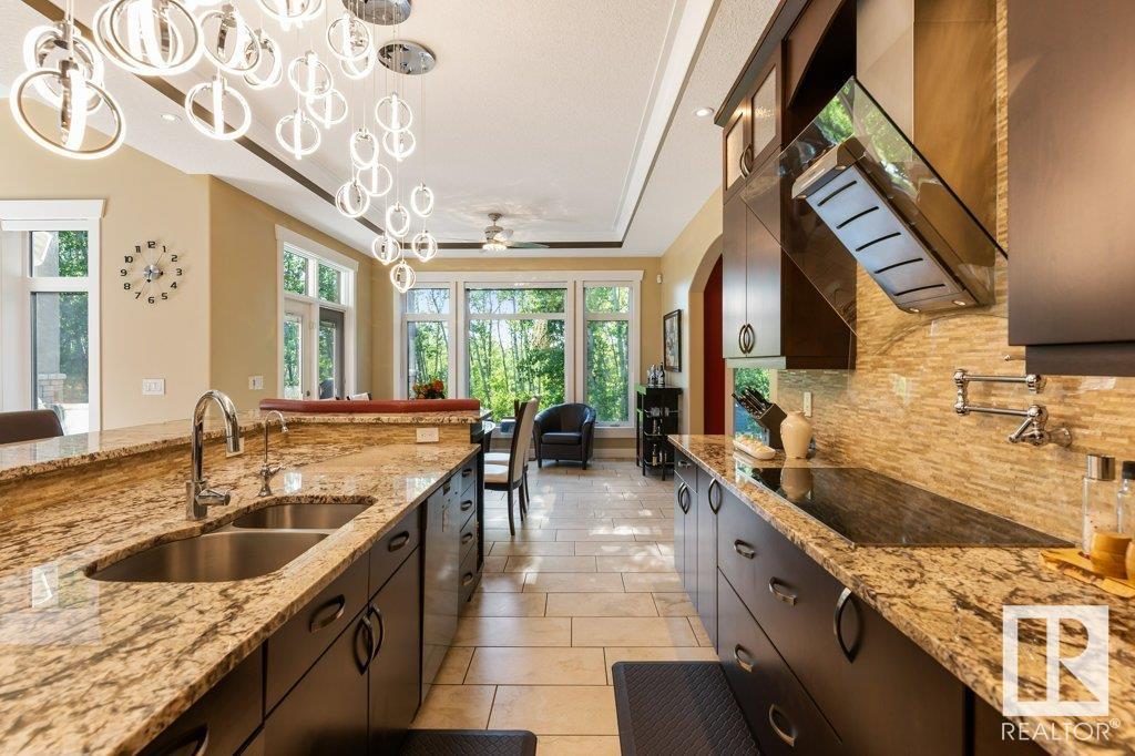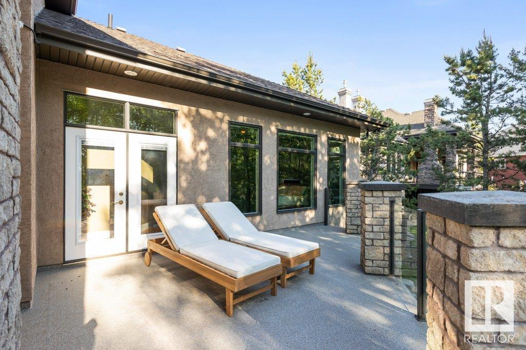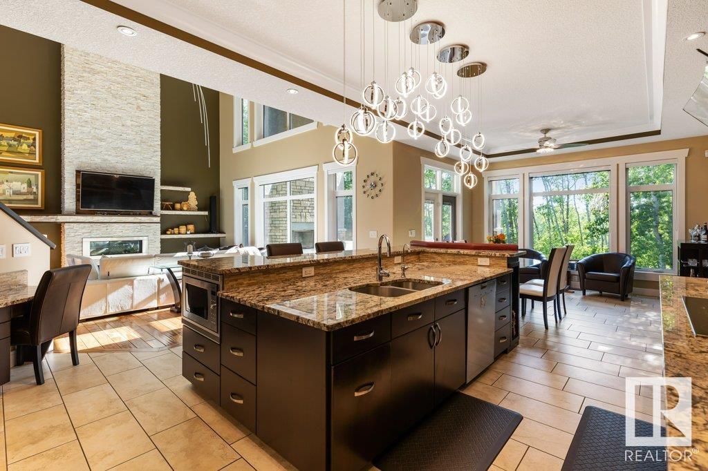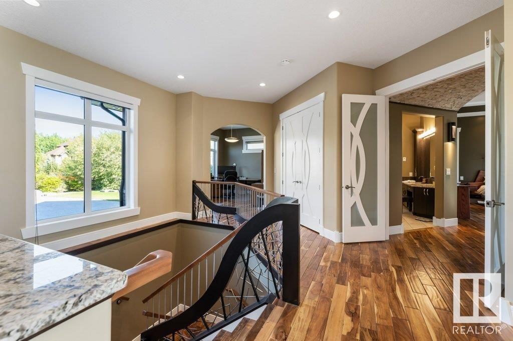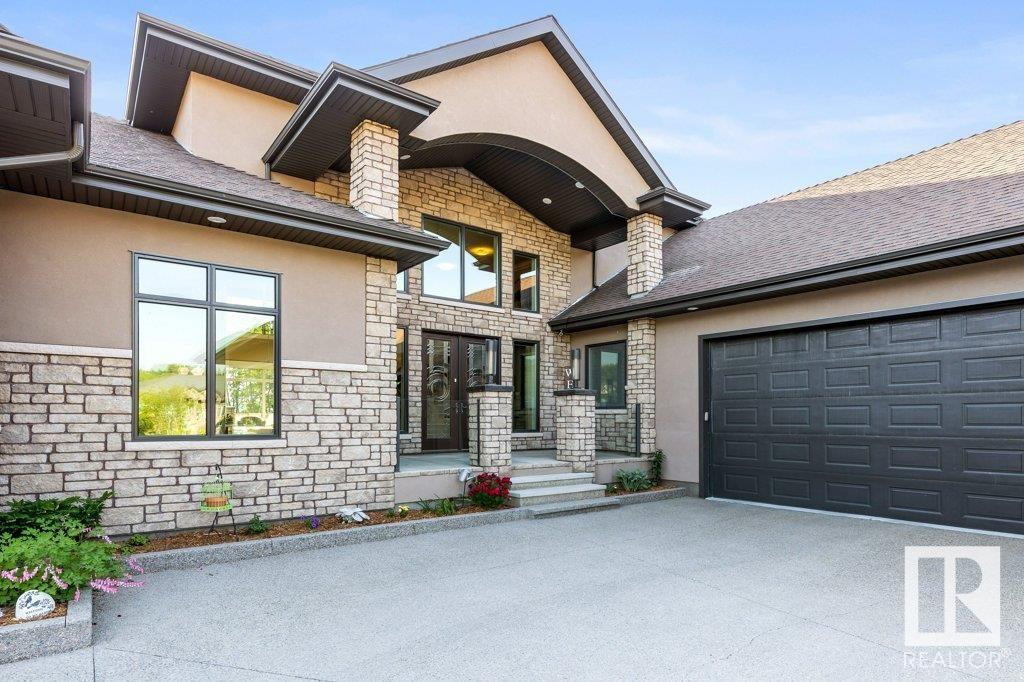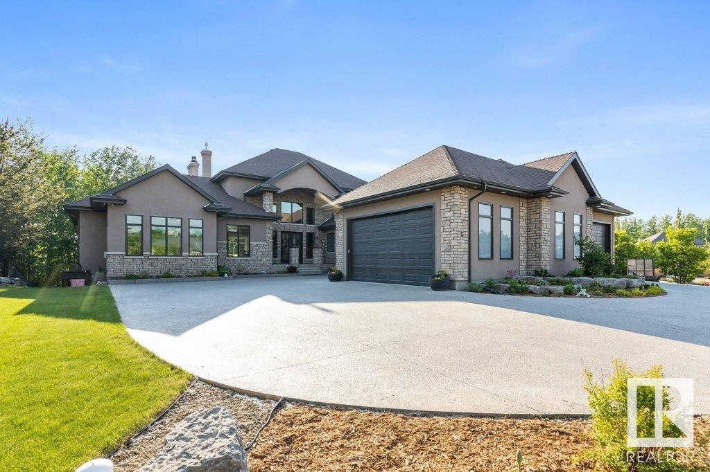 PRIVACY, SERENITY & STUNNING CURB APPEAL in THE CROSSINGS AT RIVERS EDGE. Designed to embrace it’s RAVINE & PARK RESERVE surroundings, this gorgeous 4300 sqft walkout bungalow with 5 car garage features over 7100 sqft of detailed living space. Upon entering your greeted with soaring ceilings, designer wrought iron staircase leading to the1244 sqft 2-bedroom loft with sitting area, exotic hardwoods & banks of windows letting nature in. Features of this great room bungalow include: custom millwork throughout, sun drenched rooms, CHEF’S GRANITE KITCHEN with huge breakfast bar island & walk through pantry, gorgeous cabinetry, large eating nook leading to your covered deck with feature fireplace, travertine backsplash , floor to ceiling cut quartz fireplace, RESORT STYLE PRIMARY bedroom with seven piece spa inspired ensuite, formal dining, main floor office, theatre room, workout room, five bedrooms, wine room, recreation room with cut quartz accents, wet bar, radiant heating, awesome garage, ravine firepit