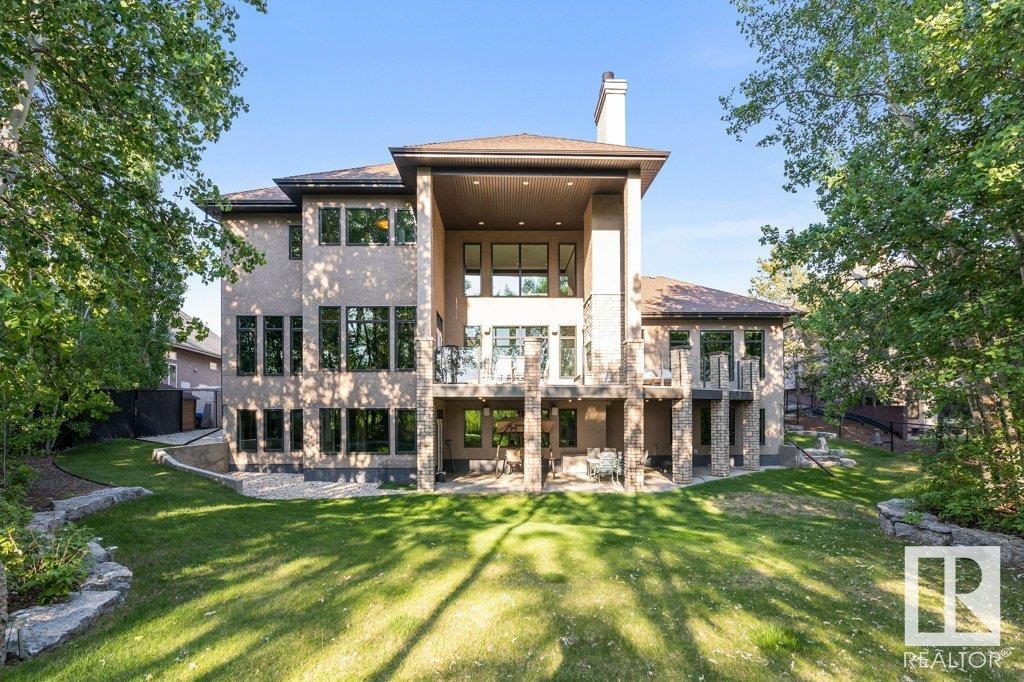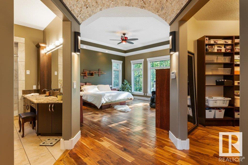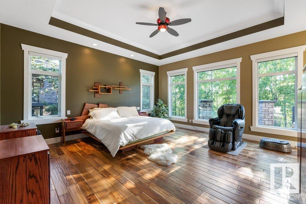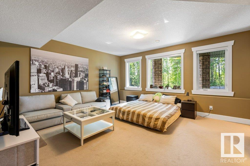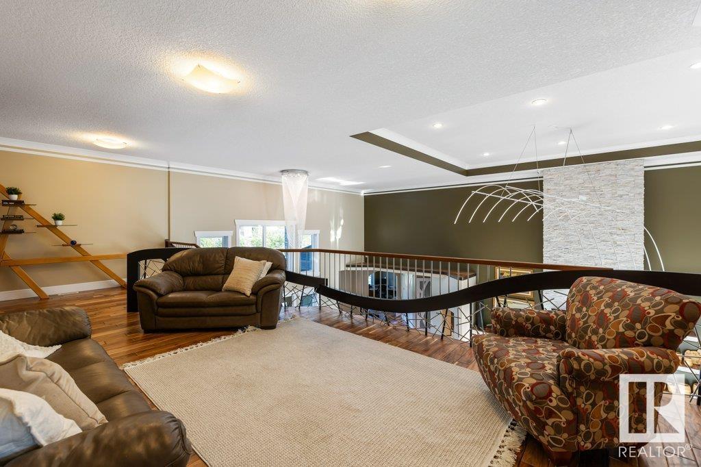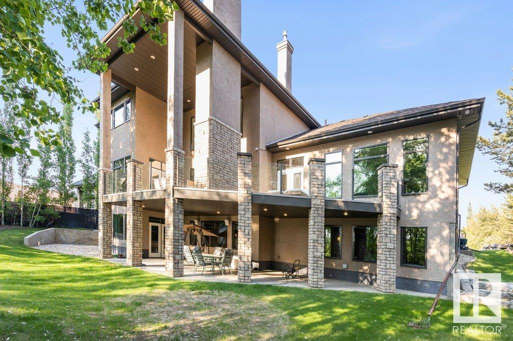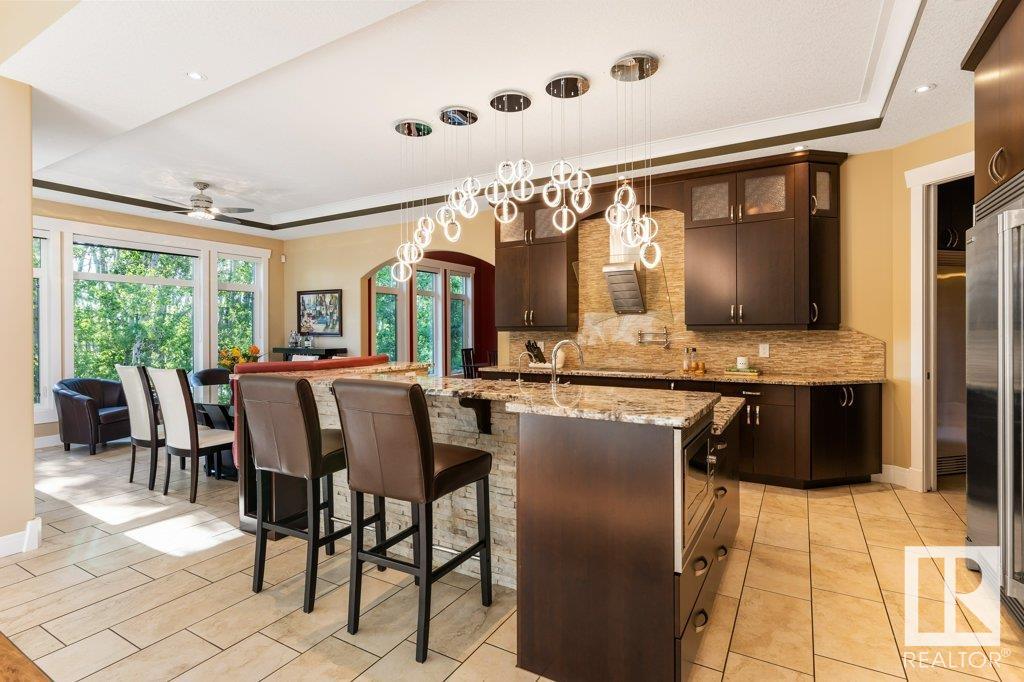 PRIVACY, SERENITY & STUNNING CURB APPEAL in THE CROSSINGS AT RIVERS EDGE. Designed to embrace it’s RAVINE & PARK RESERVE surroundings, this gorgeous 4300 sqft walkout bungalow with 5 car garage features over 7100 sqft of detailed living space. Upon entering your greeted with soaring ceilings, designer wrought iron staircase leading to the1244 sqft 2-bedroom loft with sitting area, exotic hardwoods & banks of windows letting nature in. Features of this great room bungalow include: custom millwork throughout, sun drenched rooms, CHEF’S GRANITE KITCHEN with huge breakfast bar island & walk through pantry, gorgeous cabinetry, large eating nook leading to your covered deck with feature fireplace, travertine backsplash , floor to ceiling cut quartz fireplace, RESORT STYLE PRIMARY bedroom with seven piece spa inspired ensuite, formal dining, main floor office, theatre room, workout room, five bedrooms, wine room, recreation room with cut quartz accents, wet bar, radiant heating, awesome garage, ravine firepit