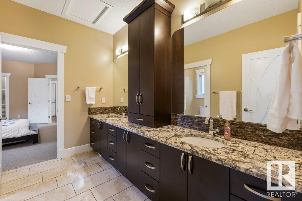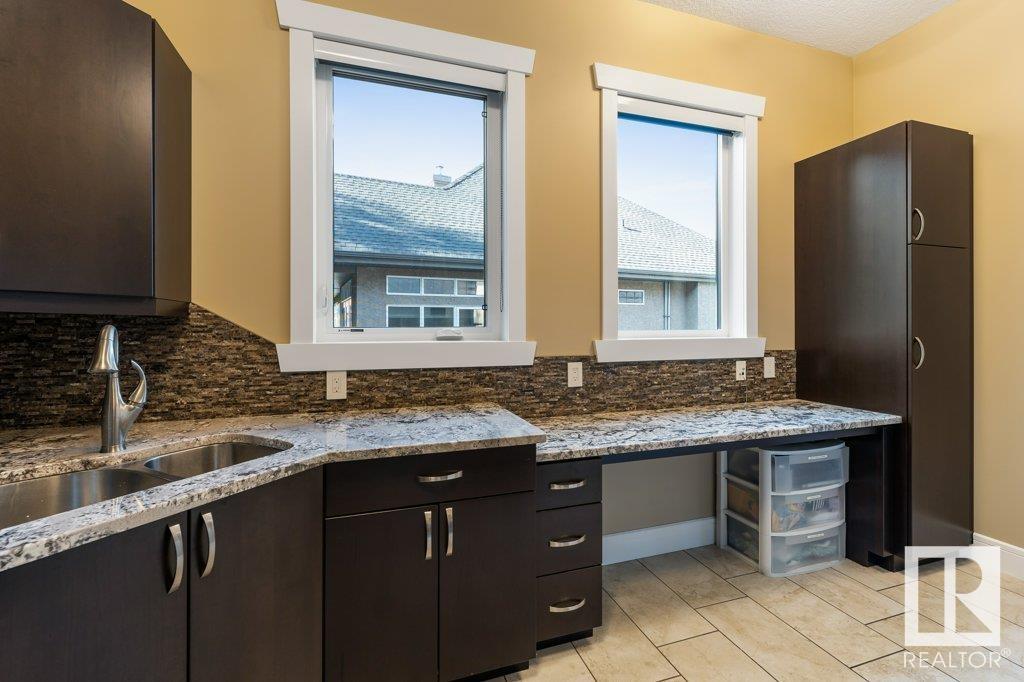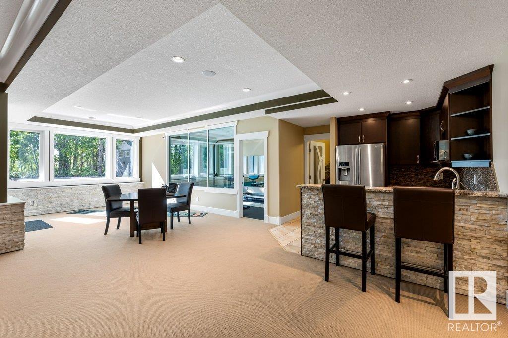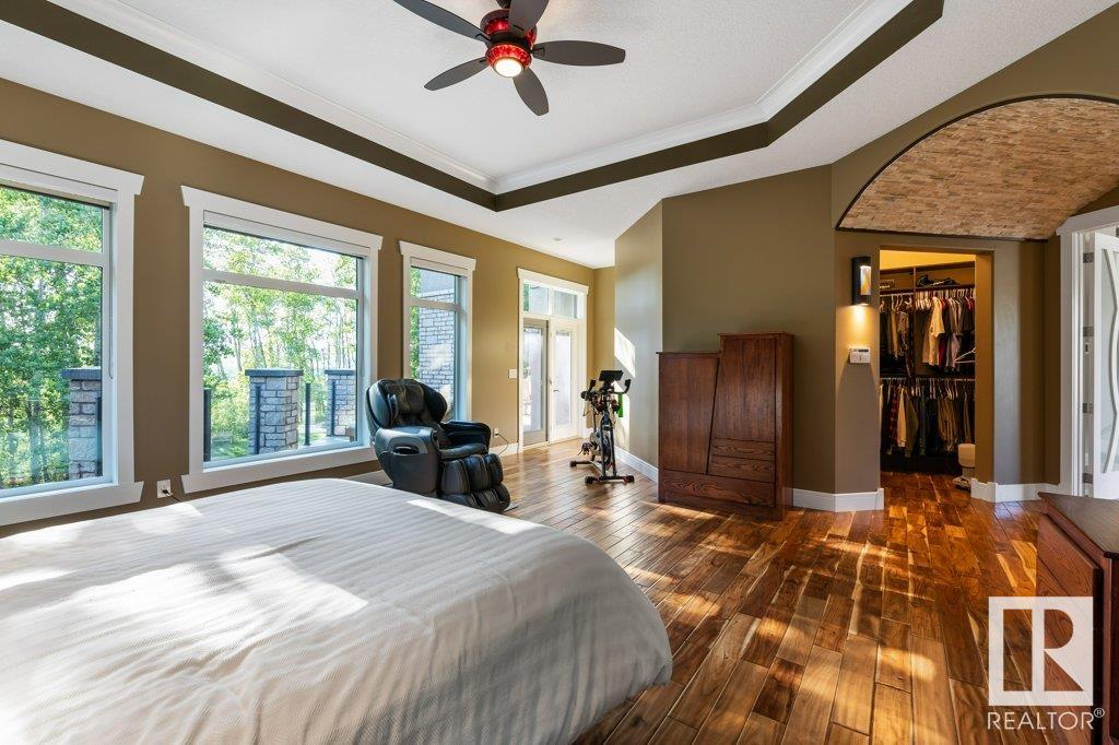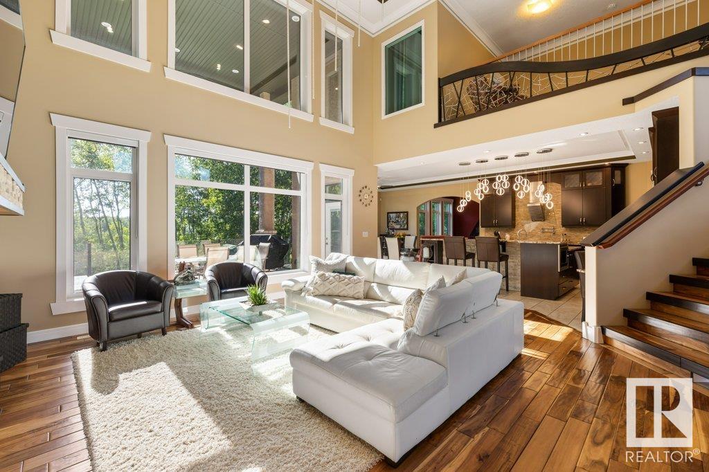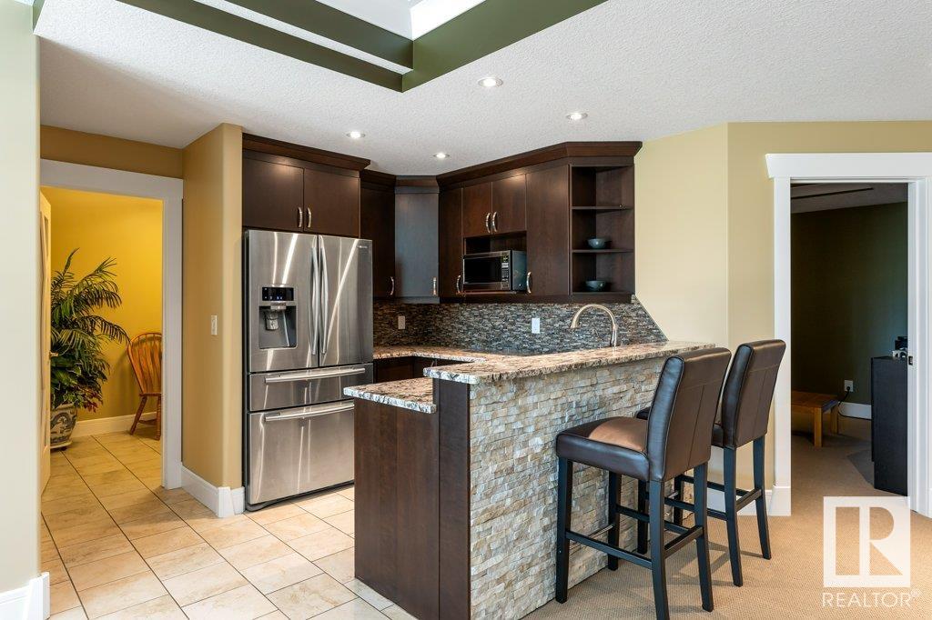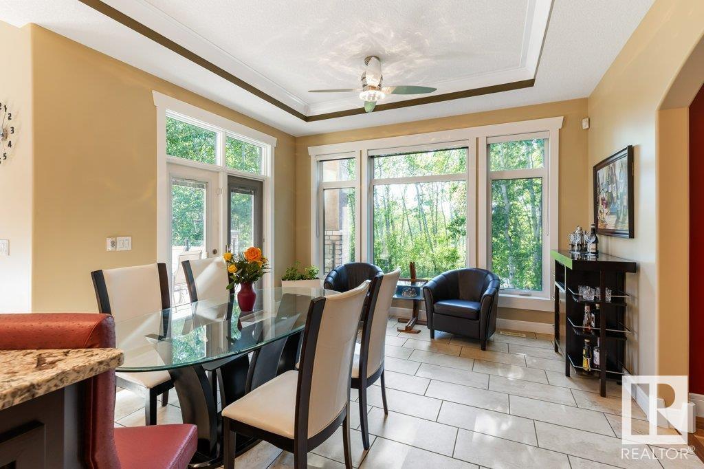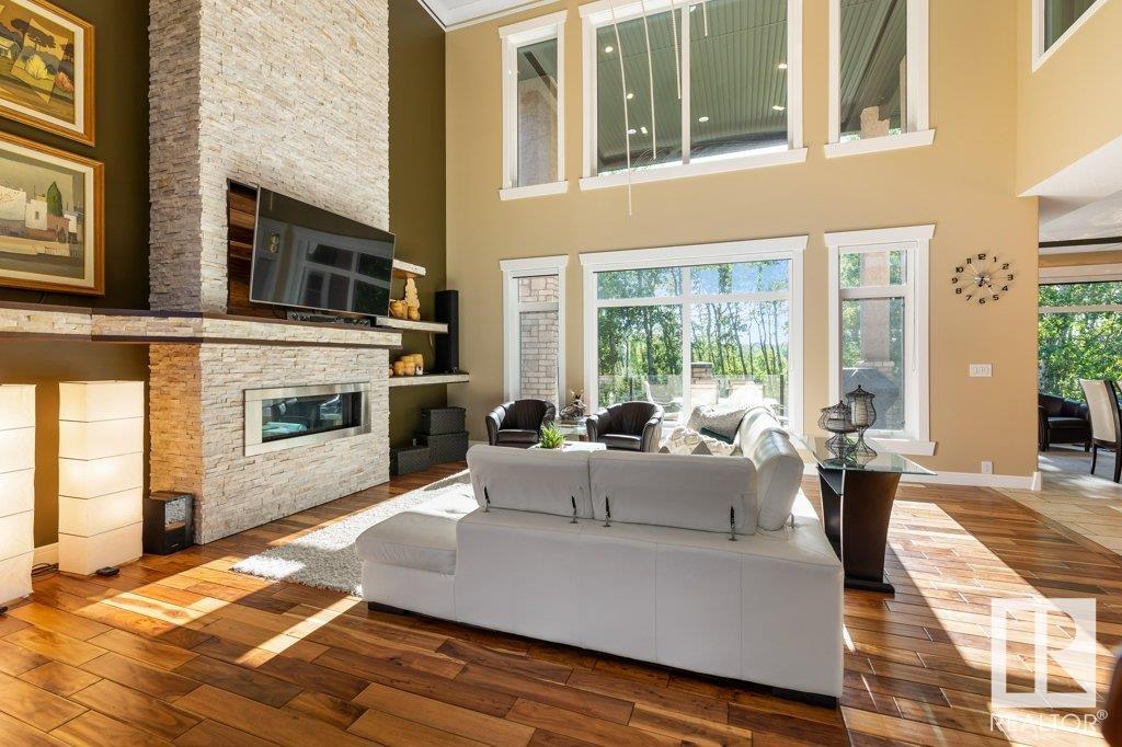 PRIVACY, SERENITY & STUNNING CURB APPEAL in THE CROSSINGS AT RIVERS EDGE. Designed to embrace it’s RAVINE & PARK RESERVE surroundings, this gorgeous 4300 sqft walkout bungalow with 5 car garage features over 7100 sqft of detailed living space. Upon entering your greeted with soaring ceilings, designer wrought iron staircase leading to the1244 sqft 2-bedroom loft with sitting area, exotic hardwoods & banks of windows letting nature in. Features of this great room bungalow include: custom millwork throughout, sun drenched rooms, CHEF’S GRANITE KITCHEN with huge breakfast bar island & walk through pantry, gorgeous cabinetry, large eating nook leading to your covered deck with feature fireplace, travertine backsplash , floor to ceiling cut quartz fireplace, RESORT STYLE PRIMARY bedroom with seven piece spa inspired ensuite, formal dining, main floor office, theatre room, workout room, five bedrooms, wine room, recreation room with cut quartz accents, wet bar, radiant heating, awesome garage, ravine firepit