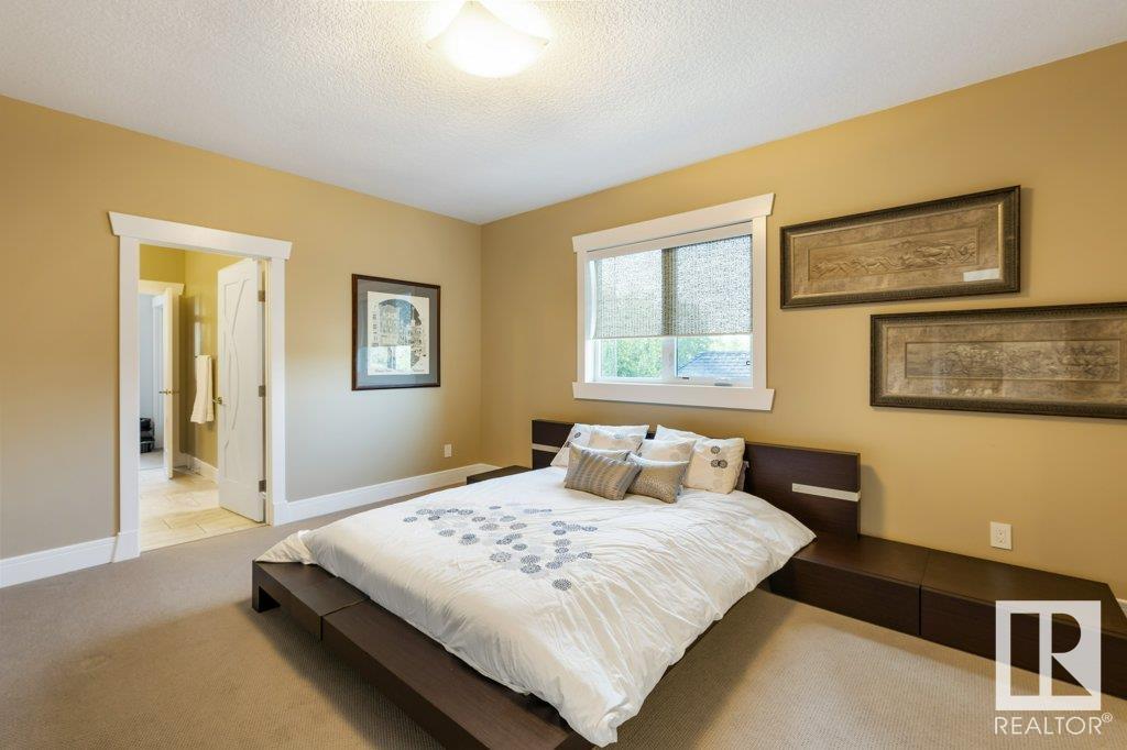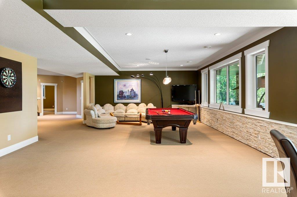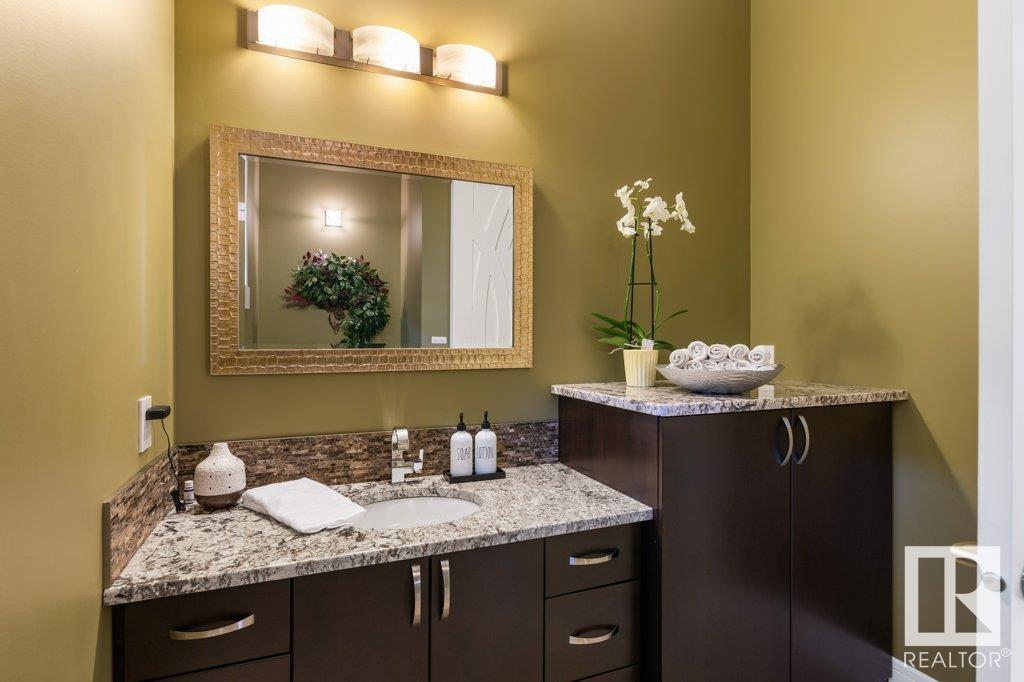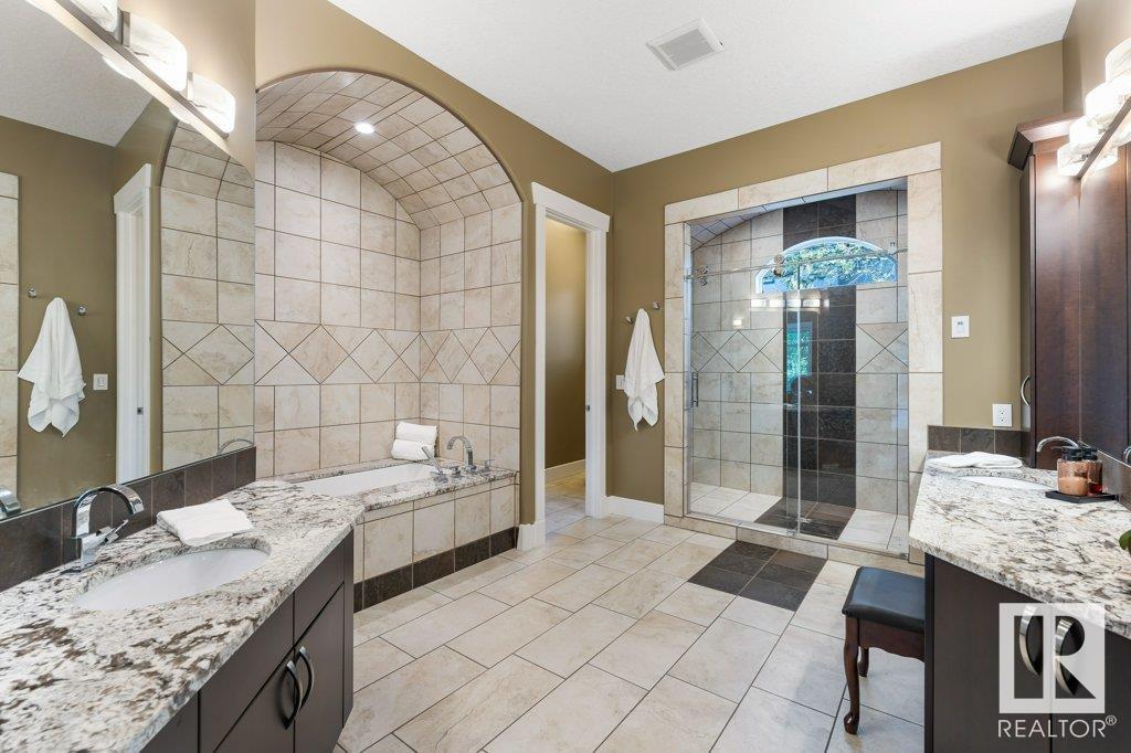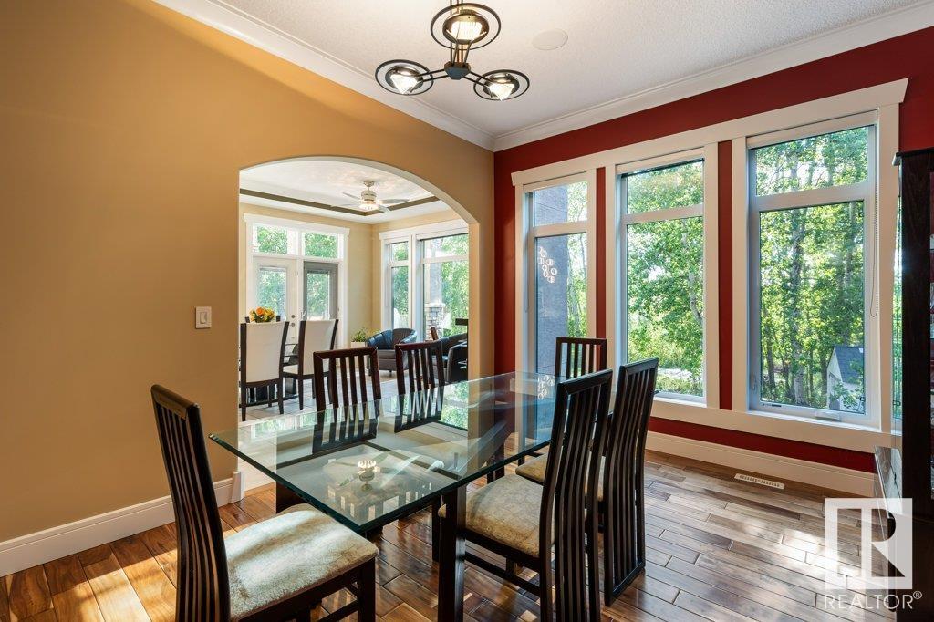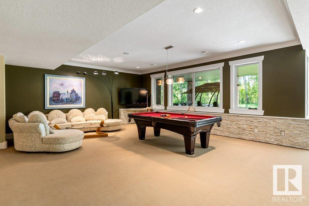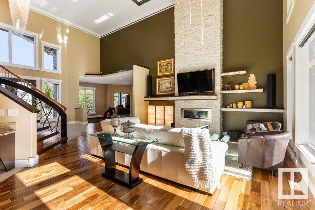 PRIVACY, SERENITY & STUNNING CURB APPEAL in THE CROSSINGS AT RIVERS EDGE. Designed to embrace it’s RAVINE & PARK RESERVE surroundings, this gorgeous 4300 sqft walkout bungalow with 5 car garage features over 7100 sqft of detailed living space. Upon entering your greeted with soaring ceilings, designer wrought iron staircase leading to the1244 sqft 2-bedroom loft with sitting area, exotic hardwoods & banks of windows letting nature in. Features of this great room bungalow include: custom millwork throughout, sun drenched rooms, CHEF’S GRANITE KITCHEN with huge breakfast bar island & walk through pantry, gorgeous cabinetry, large eating nook leading to your covered deck with feature fireplace, travertine backsplash , floor to ceiling cut quartz fireplace, RESORT STYLE PRIMARY bedroom with seven piece spa inspired ensuite, formal dining, main floor office, theatre room, workout room, five bedrooms, wine room, recreation room with cut quartz accents, wet bar, radiant heating, awesome garage, ravine firepit