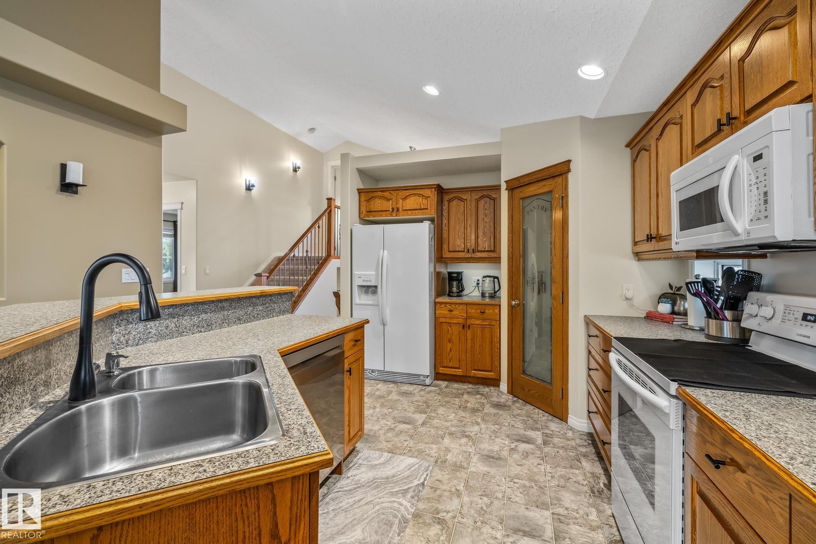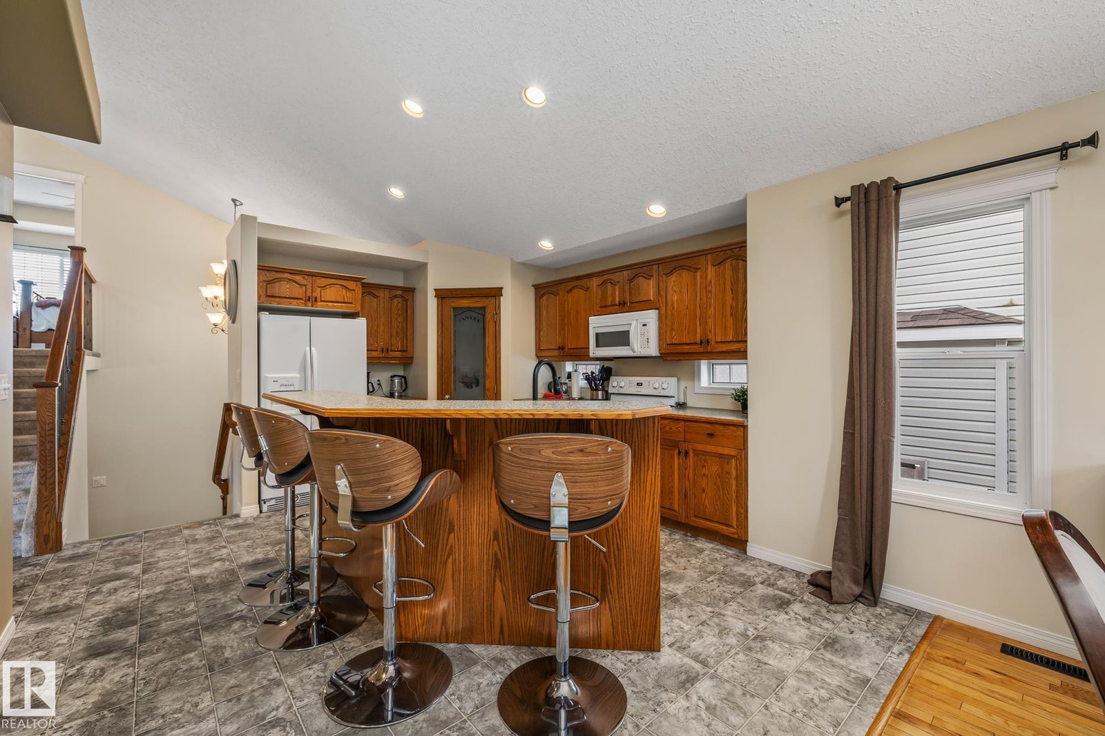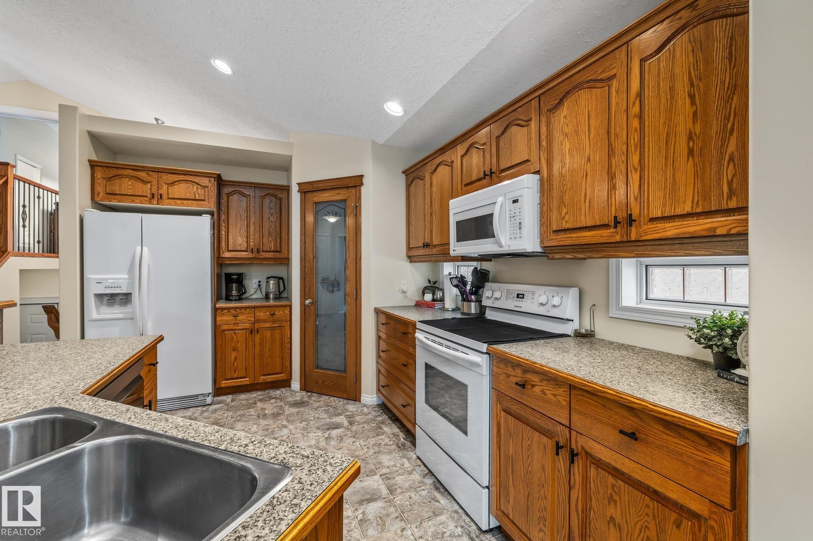 Welcome to this freshly painted, fully finished bilevel with 5 bedrooms & 3 baths—designed for everyday family living. With a brand new roof, furnace, carpet & hot water on demand, this home offers comfort & peace of mind. The open concept kitchen with corner pantry & raised eating bar flows into a dining space that opens to the deck—perfect for family meals or gatherings. The cozy living room features vaulted ceilings, hardwood floors, gas fireplace & plenty of sunlight. Upstairs, the primary retreat includes a walk-in closet & 4-pc ensuite. The landscaped backyard is made for daily enjoyment with a covered deck, stone patio, fruit tree & gas hook-up for year-round BBQs. Just a stone’s throw from the pond, you’ll love evening walks & morning coffee by the water. The fully finished basement adds 2 bedrooms, family room & 4-pc bath. An oversized insulated garage with hot/cold taps, floor drain & tons of storage completes the package. Close to schools & all amenities.