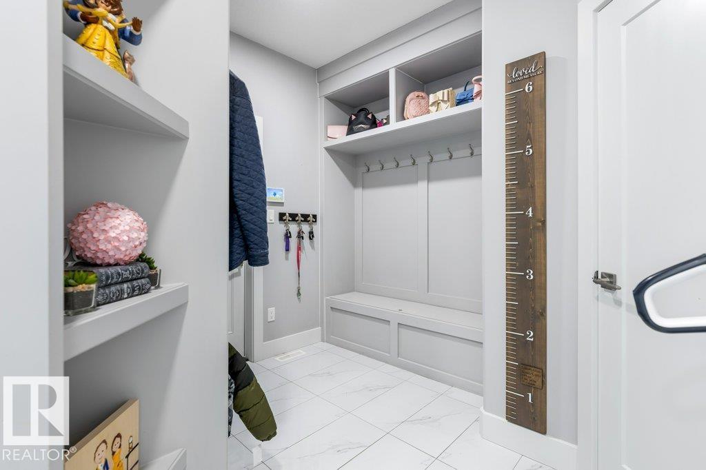 Prime location backing walking trails and step from the park! Step into a bright foyer leading to a dramatic 18-ft great room with a striking tiled feature wall and elegant coffered ceiling. The gourmet kitchen boasts ceiling-height cabinetry, stainless steel appliances, a large breakfast bar island, and a convenient walk-through pantry. A functional mudroom with built-ins and a versatile main-floor den enhance everyday living. A sleek glass-railed staircase leads to the upper level, featuring 3 bedrooms, 2 baths, and a generous bonus room. The primary suite offers a spa-inspired ensuite with a Jacuzzi tub, double vanity, tiled shower, and an expansive walk-in closet. The unfinished basement awaits your final touches. Additional highlights include quartz countertops, built shelving, a two-tiered deck overlooking green space, 9-ft ceilings on main and basement, 12×24 tile flooring, upgraded soft-close cabinetry, and abundant pot lighting. A stylish, well-appointed home in an unbeatable setting!