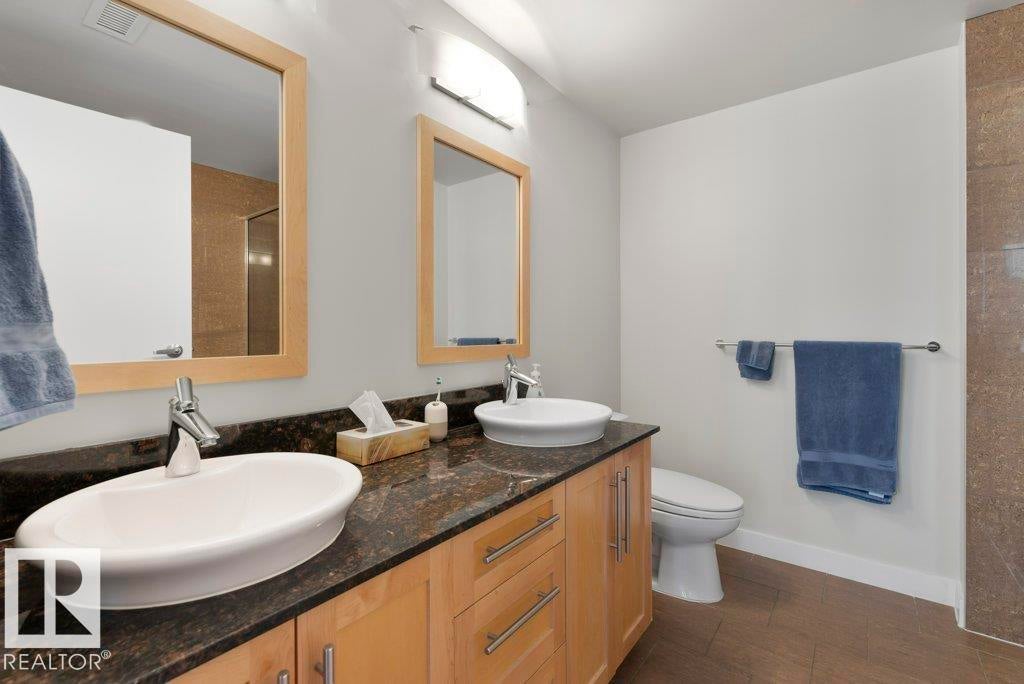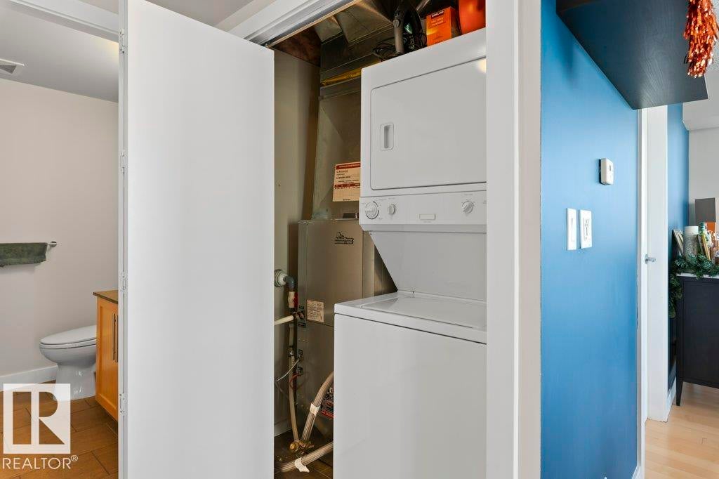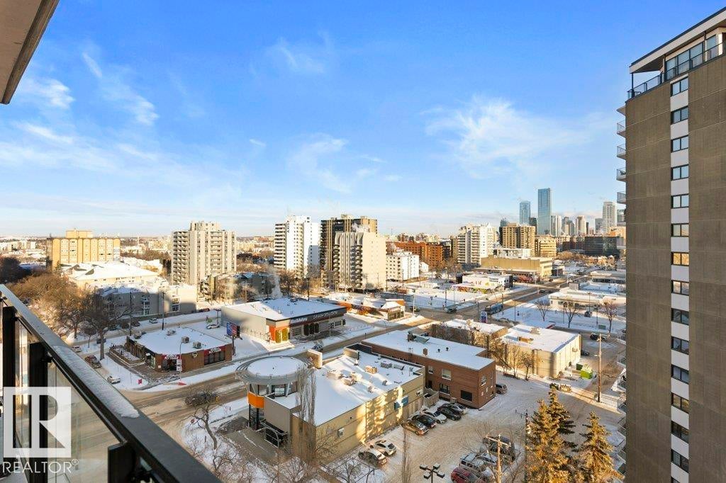 Elevate your downtown lifestyle in this IMMACULATE 11th-FLOOR executive condo with 2 bedrooms + DEN, 2 full baths, 2 TITLED UNDERGROUND parking stalls w/ storage PLUS the rare bonus of only 4 UNITS PER FLOOR for added privacy! This bright CORNER UNIT offers stunning east & north city views through FLOOR-TO-CEILING windows and a large balcony w/ natural gas BBQ hookup, perfect for entertaining above it all. A thoughtfully designed space features hardwood floors, a modern kitchen with granite counters, tons of cabinets, and a versatile den ideal for a home office or dining space. The spacious primary suite includes a WALK-IN closet & spa-inspired 5-PIECE ENSUITE with soaker tub and DOUBLE sinks. Enjoy year-round comfort with a heat pump system (furnace & A/C replaced in 2022) and in-suite laundry. Well-managed building w/ gym and ample visitor parking. Steps to Jasper Ave, restaurants, river valley trails, and everything downtown has to offer, this is urban living done right!