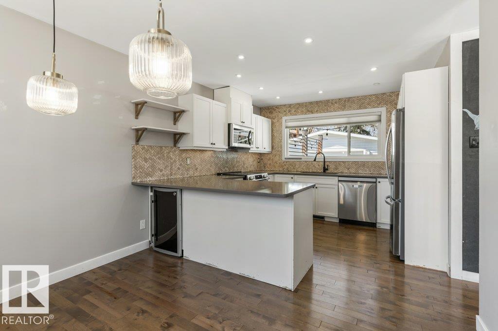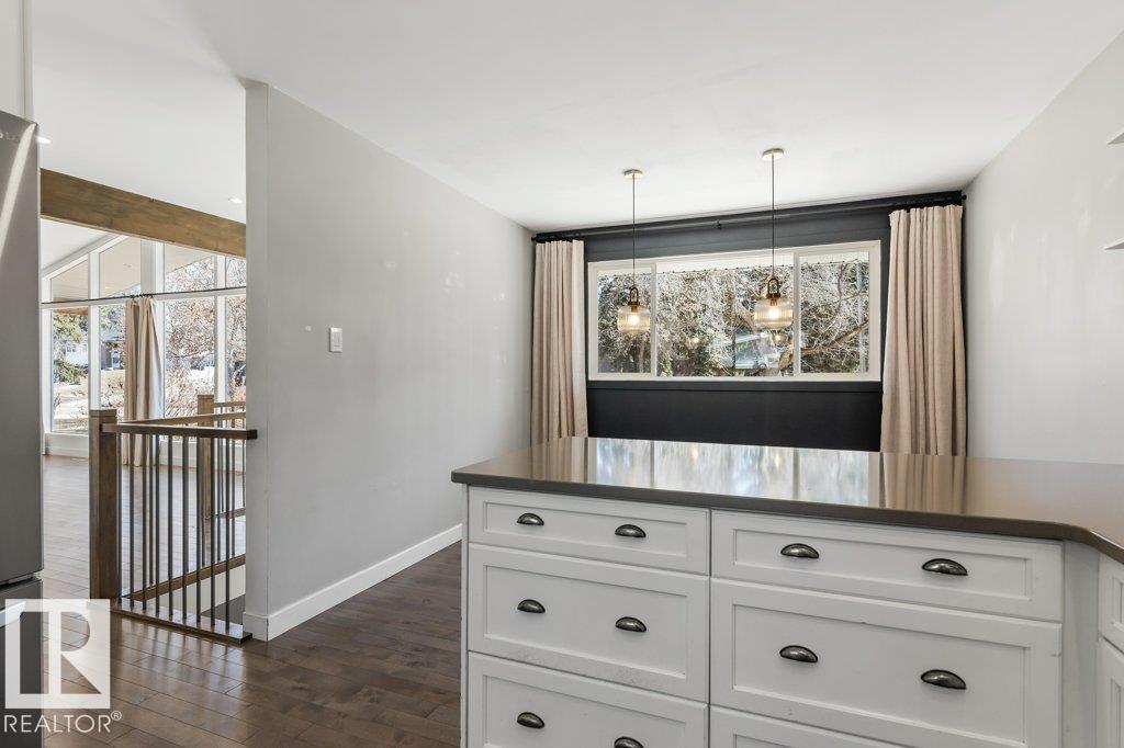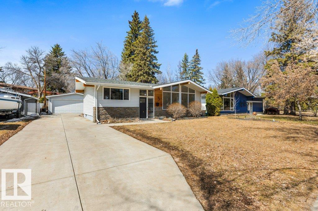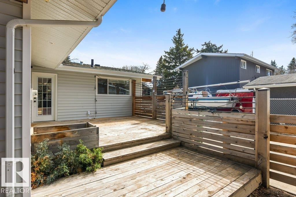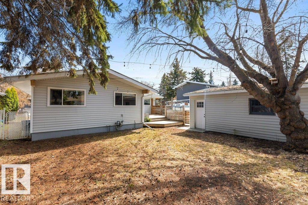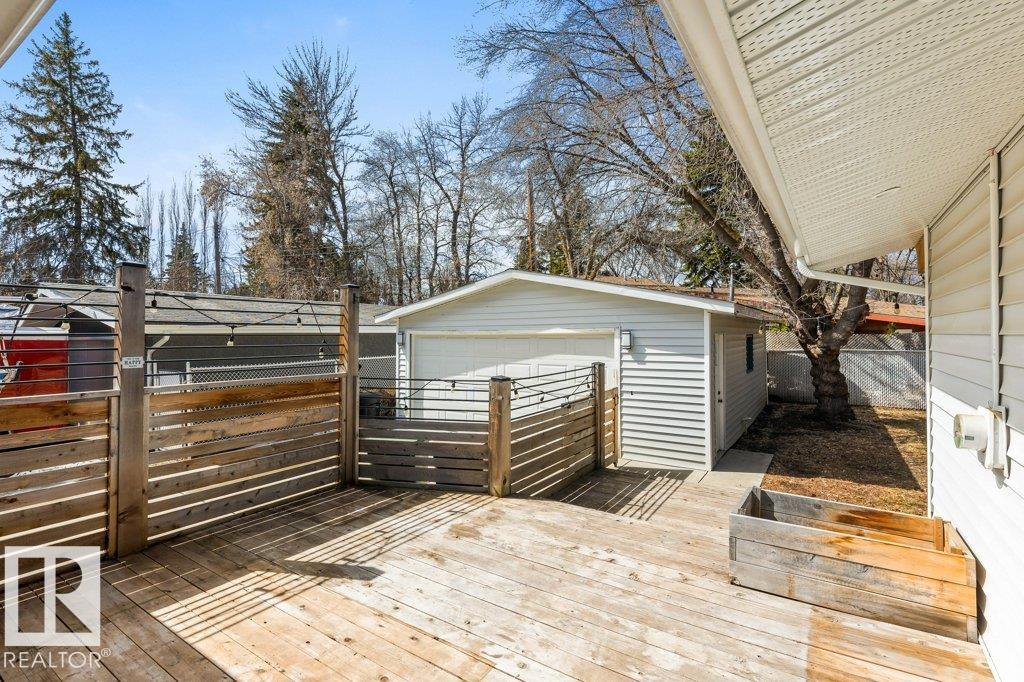 Welcome to this beautifully maintained 1,216 sq ft bungalow in the sought-after Gardens neighborhood of St. Albert. This home offers three spacious bedrooms on the main floor, including a primary suite with its own 3-piece ensuite, plus a full 4-piece main bath. The bright and inviting living room features vaulted ceilings, open beams, and large banks of windows that flood the space with natural light. The updated kitchen boasts quartz countertops and stainless steel appliances, with a separate dining area ideal for family meals and entertaining. Downstairs, the fully finished basement provides a large recreation room, versatile flex space, and ample storage with a dedicated laundry area and additional room for future development. Outside, enjoy a private deck with a built-in privacy screen, perfect for relaxing or hosting guests, along with a double detached garage. Located in a fantastic neighborhood close to downtown, Lions Park, the farmers’ market, schools, and all amenities.